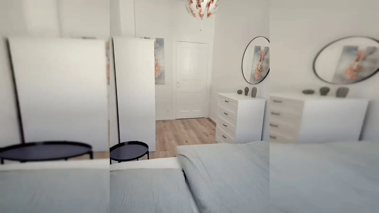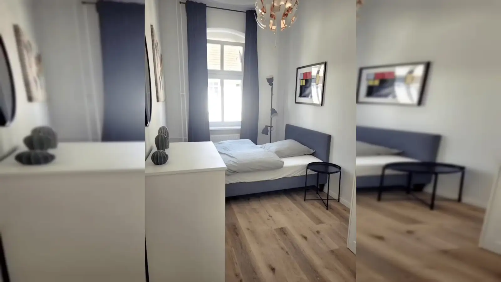 Das Apartment ist ausgestattet mit einem Kingsize-Boxspringbett mit hochwertiger Bettwäsche, zwei Nachttischen, einer Stehlampe, einer Kommode, einem großen Kleiderschrank, moderner Kunst und einem Schreibtisch mit passendem Stuhl. Alle Fenster verfügen über Verdunkelungsvorhänge, sodass das Apartment komplett abgedunkelt werden kann. Außerdem gibt es eine kleine Küche mit allen notwendigen Kochutensilien. Nicht zuletzt bietet das Apartment ein exklusives Badezimmer mit Dusche und einem eleganten Spiegelwaschbecken.