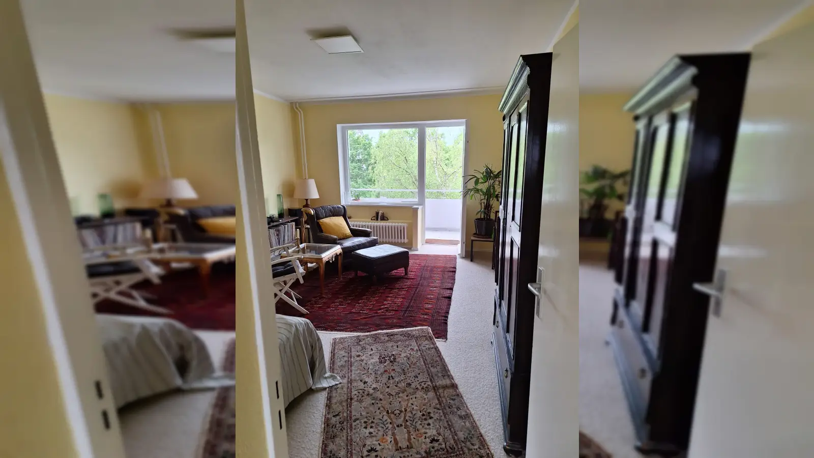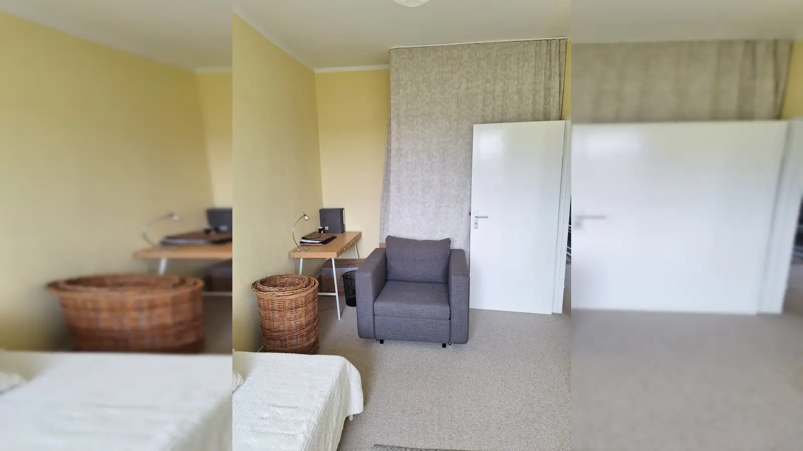 Kleines Zimmer/Schlafzimmer: Schlafsofa, Nachttisch, Sessel, Schreibtisch mit Stuhl, Vase, TV-Ständer, begehbarer Kleiderschrank mit Raumteiler und Kleiderstangen, Wäscheschrank