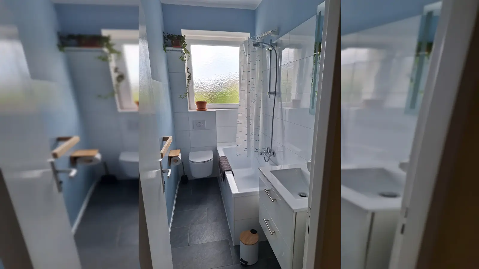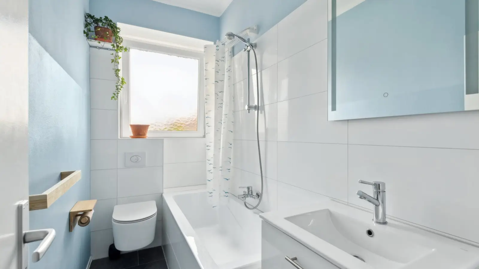 Modernes Badezimmer Komplett ausgestattet mit Badewanne, Duschvorhang und Accessoires – Funktionalität trifft auf klares Design.