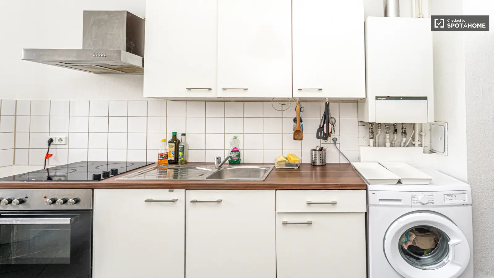 Die Küche ist mit modernen Geräten ausgestattet, darunter ein Backofen und eine Waschmaschine.