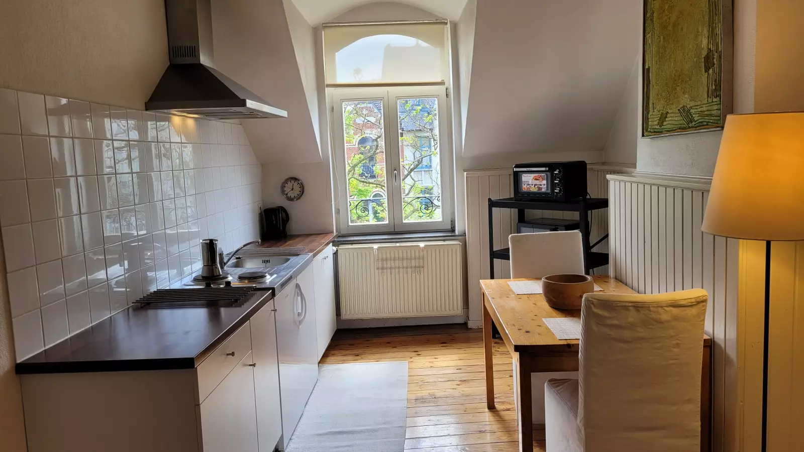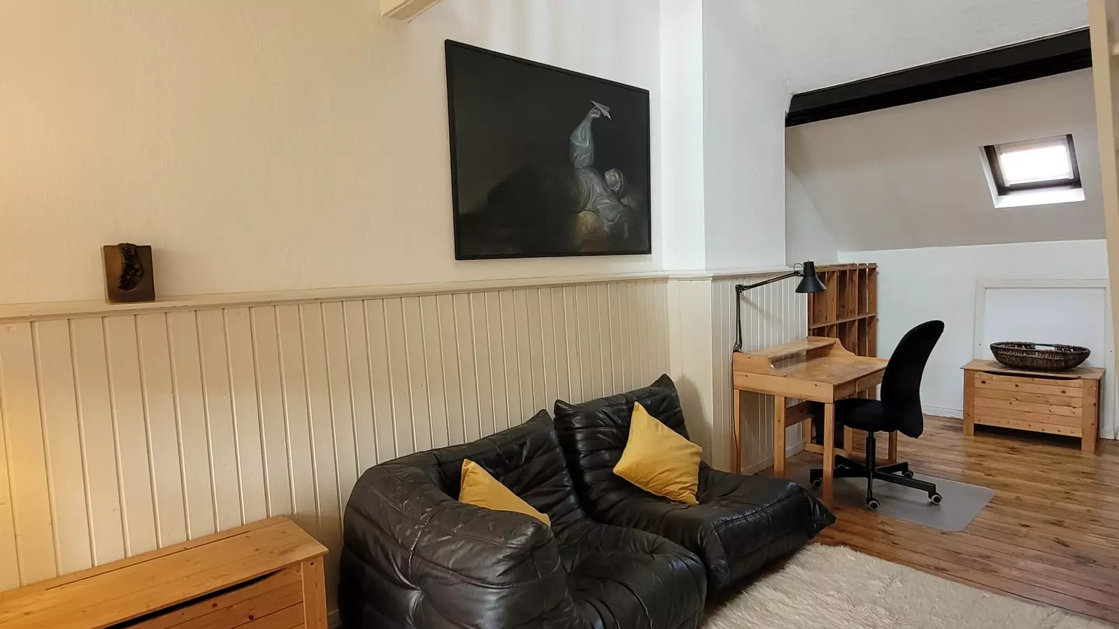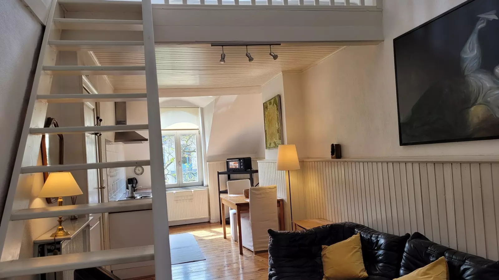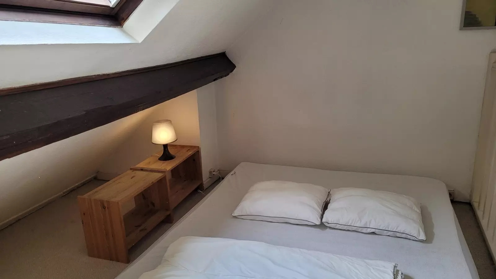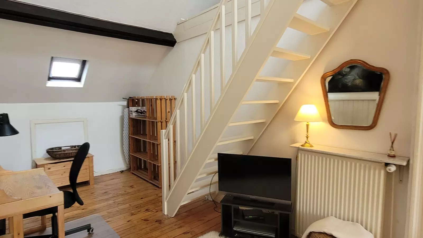 Das Anwesen befindet sich in einem riesigen charmanten Brüsseler Stadthaus aus dem Jahr 1910, das stilvoll an ein modernes Wohnen angepasst wurde. Ein geschmackvoll eingerichtetes Studio-Apartment von 65 Quadratmetern befindet sich im Viertel Place Albert. Die Wohnung befindet sich im Dachgeschoss (2. Stock) des Hauses des Vermieters, und ihr offener Raum besteht aus einem Wohnbereich mit Sofa und Sat-TV, einer ausgestatteten Küchenzeile mit Essecke, einem Arbeitsbereich mit Stuhl und Schreibtisch. Die Küche ist mit Kochplatten, Backofen, Mikrowelle, Kühlschrank, Wasserkocher, Toaster, Tellern, Töpfen usw. ausgestattet. Das Badezimmer ist mit einer Toilette ausgestattet. Ihr Schlafzimmer mit Einbauschränken befindet sich im Zwischengeschoss unter originalen Balken. Bettwäsche und Handtücher werden gestellt. Gemeinsame Waschküche ist im Keller.