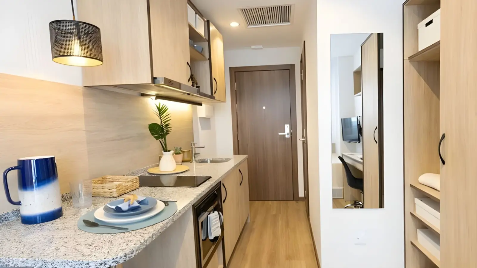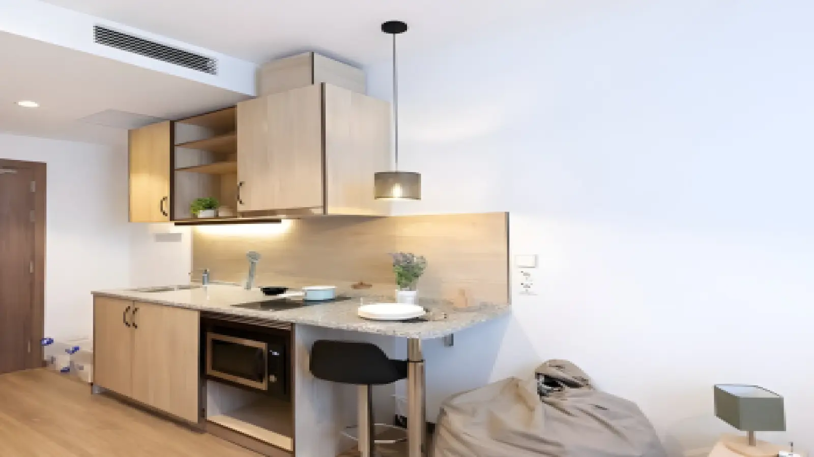Dieses Studio bietet ein gemütliches Wohnerlebnis mit möblierter Einrichtung, Balkon, elektrischer Heizung und individueller Klimaanlage. Die Nebenkosten sind in der Miete enthalten.