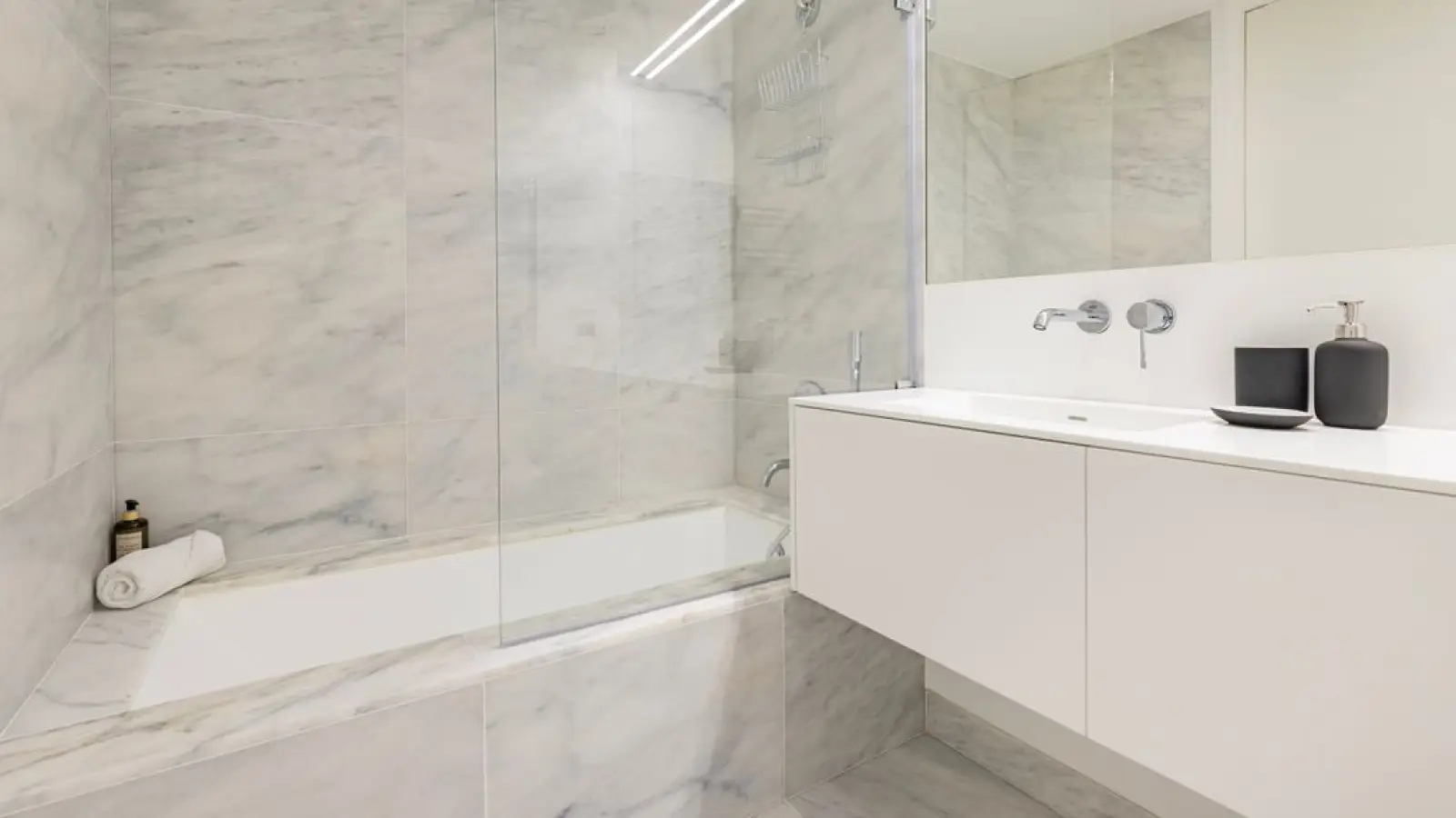 BADEZIMMER - 1 Badezimmer mit Badewanne, großem Spiegel, WC und Haartrockner.
