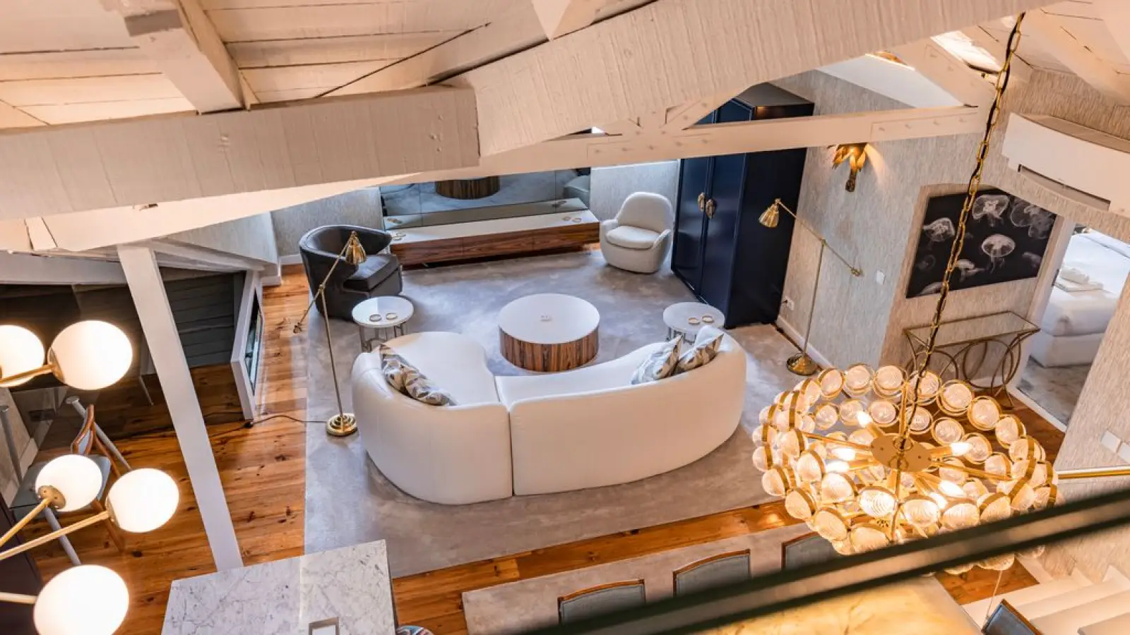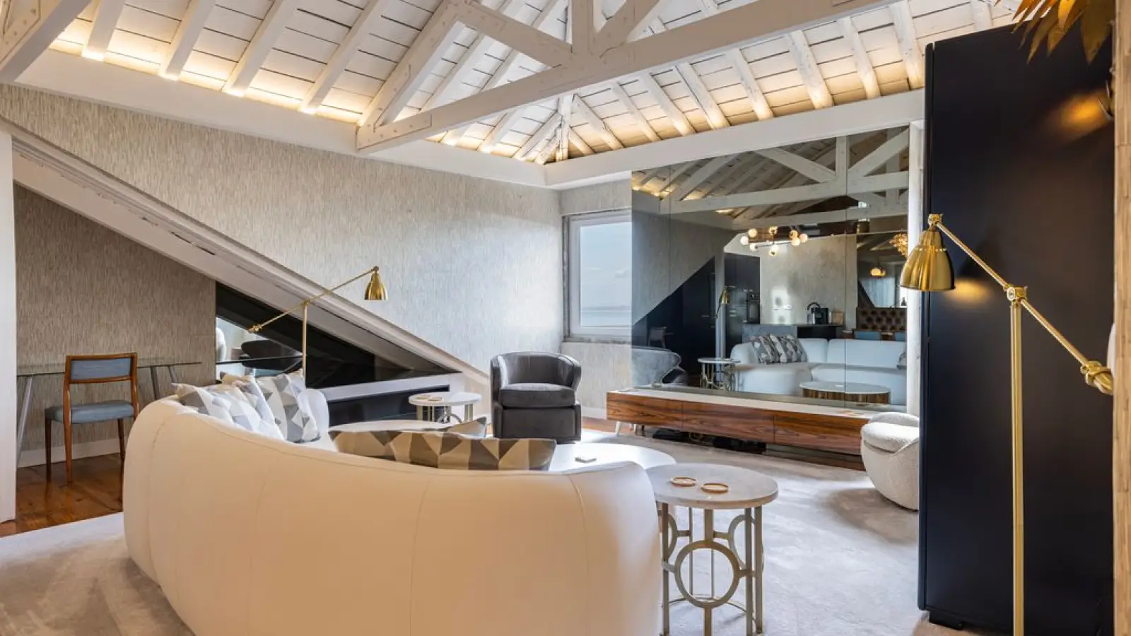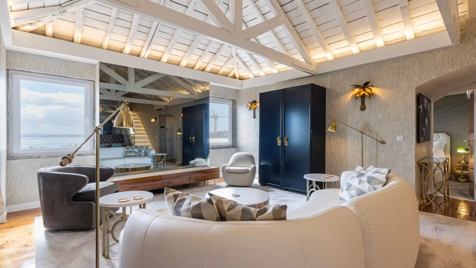 Panorama-Wohnbereich: Ein offener Wohnbereich mit zwei großen Fenstern, die den Raum mit natürlichem Licht durchfluten und einen traumhaften Flussblick bieten. Ein verspiegelter Fernseher, goldene Akzente und ein elegantes weißes Sofa schaffen eine stilvolle und zugleich harmonische Atmosphäre.