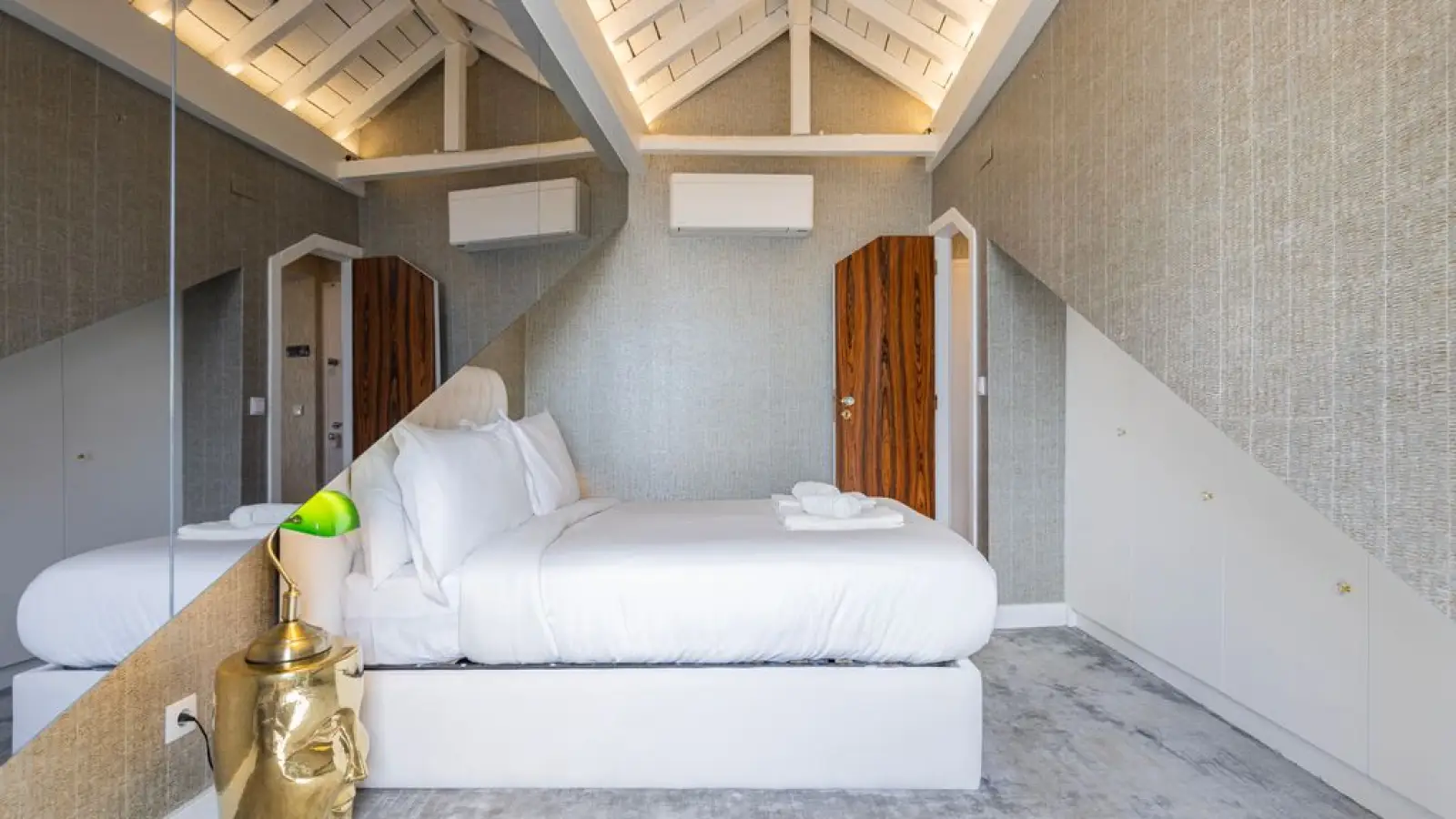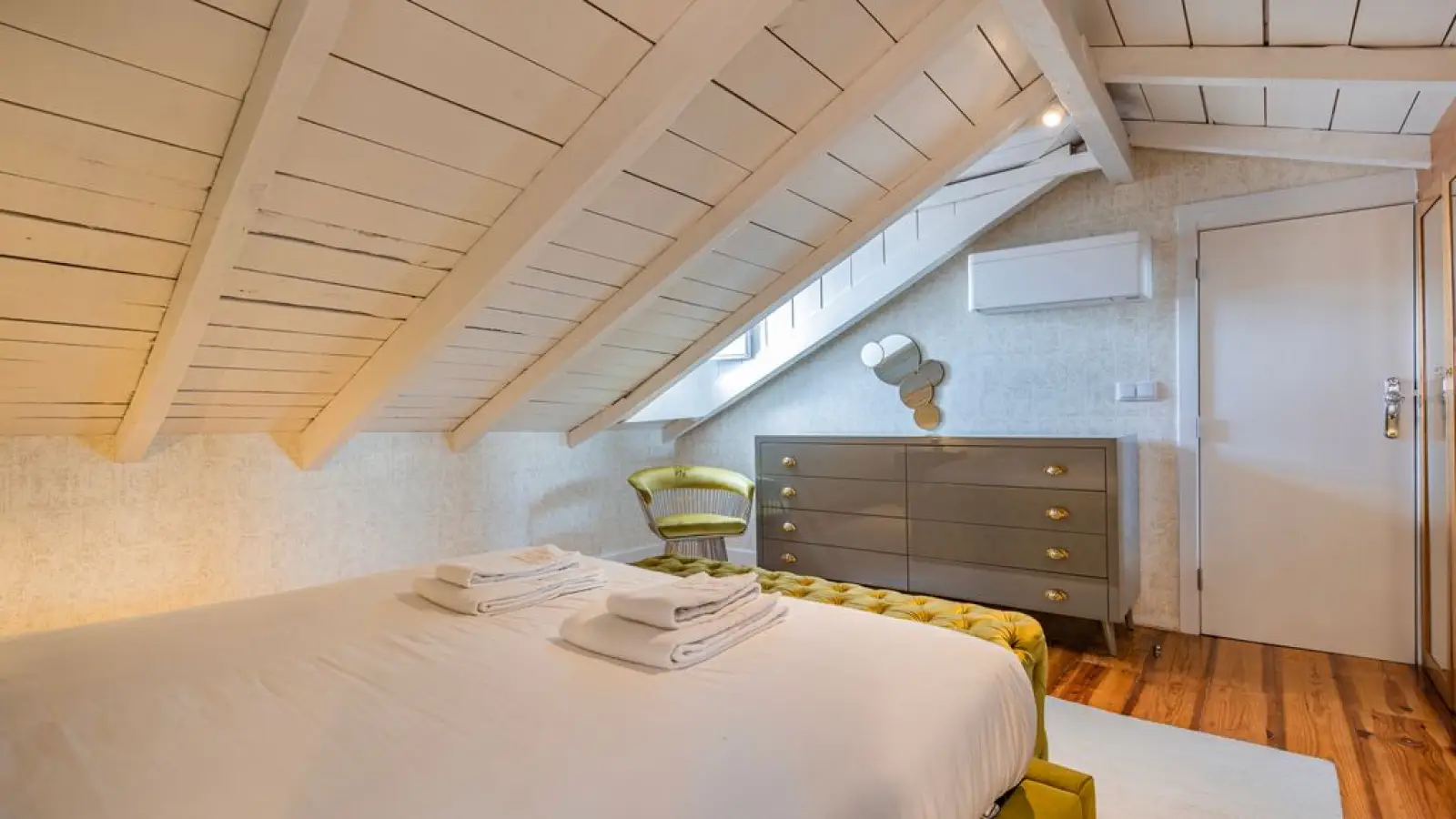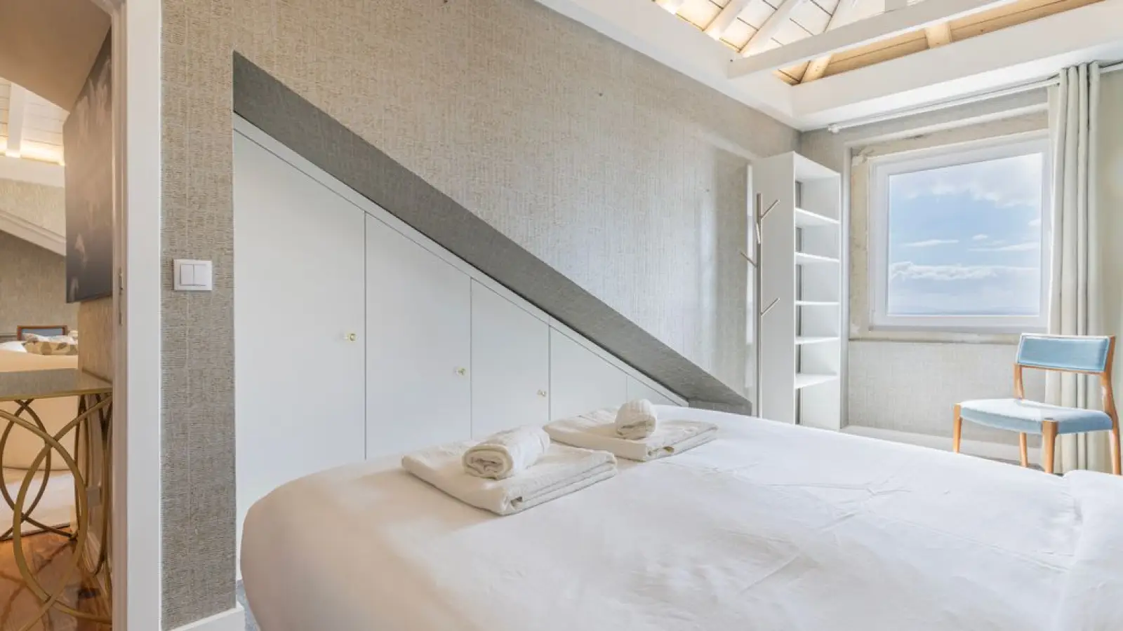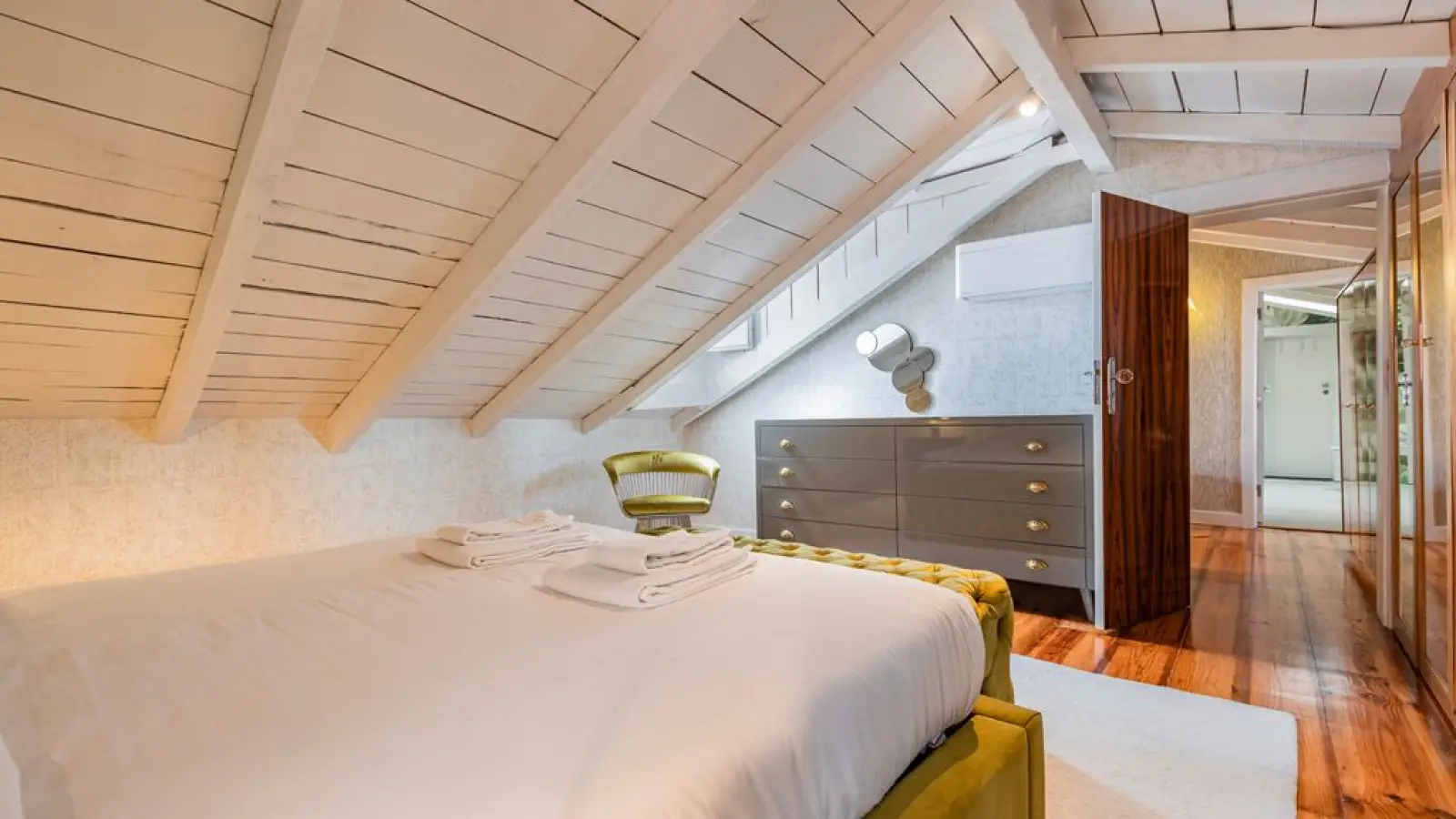 Master-Suite im Obergeschoss – Queensize-Bett, großzügiger Kleiderschrank, sanftes Tageslicht und ein stilvolles Badezimmer en suite mit besonderem Design.