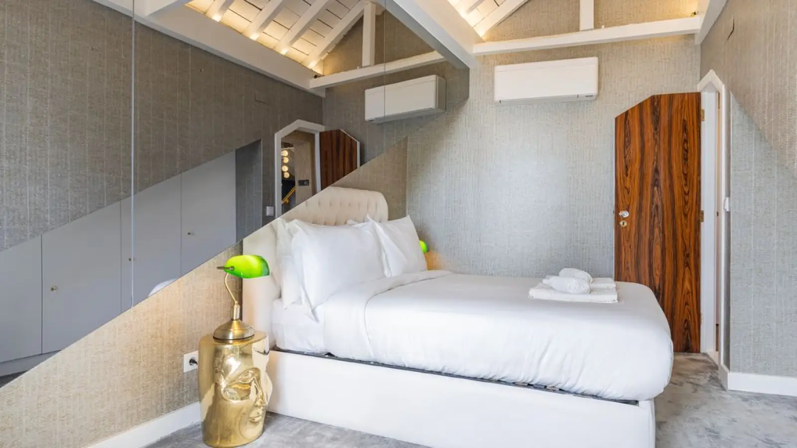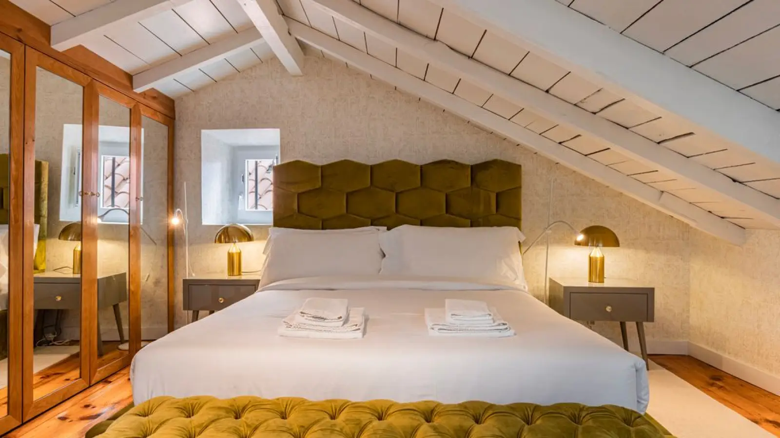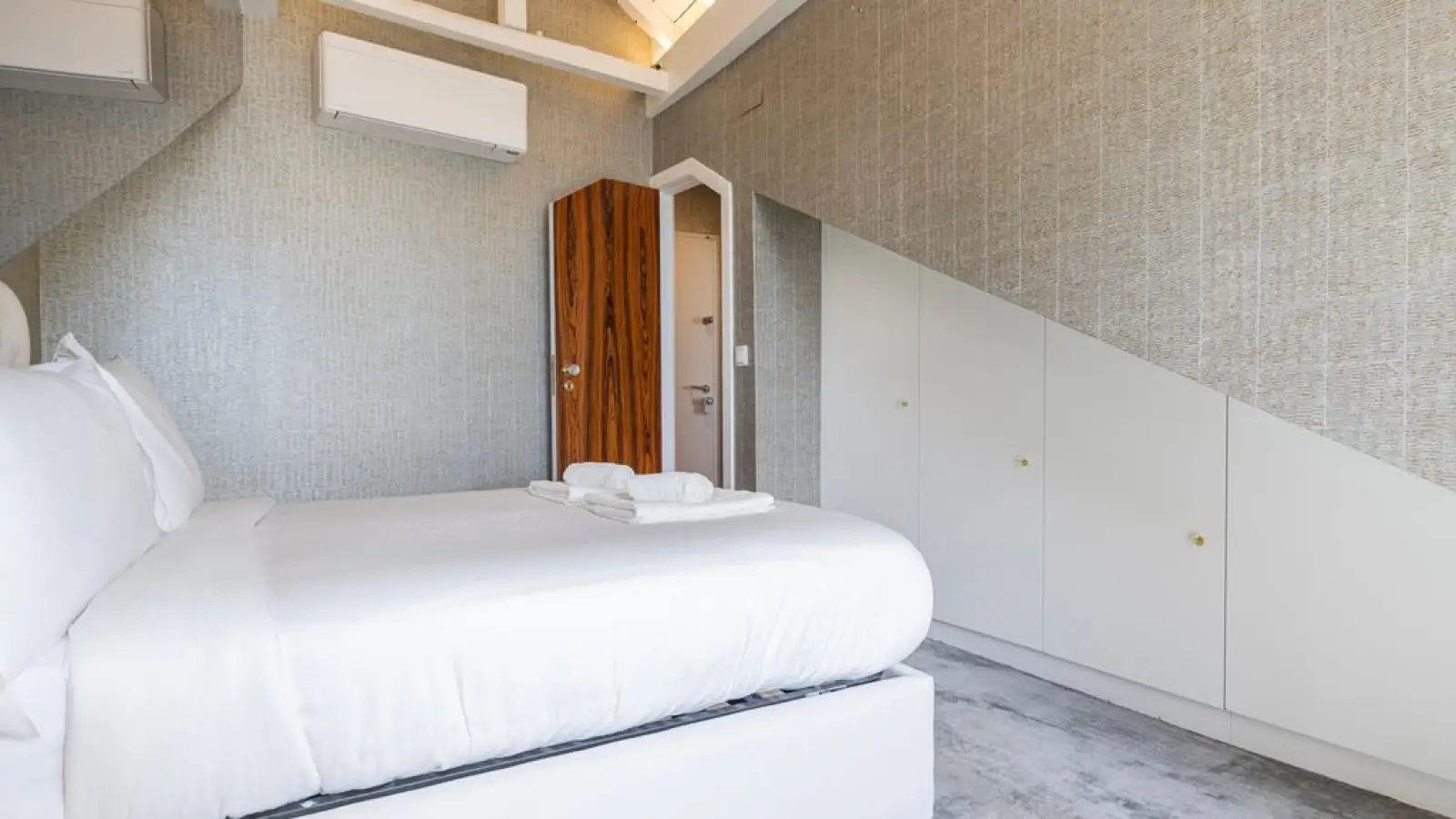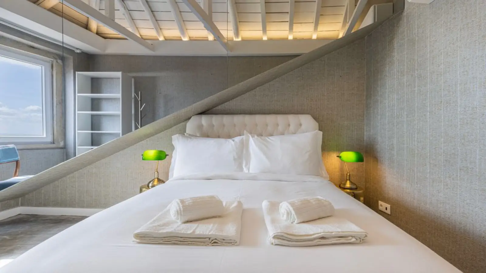 Master-Suite im Obergeschoss – Queensize-Bett, großzügiger Kleiderschrank, sanftes Tageslicht und ein stilvolles Badezimmer en suite mit besonderem Design.