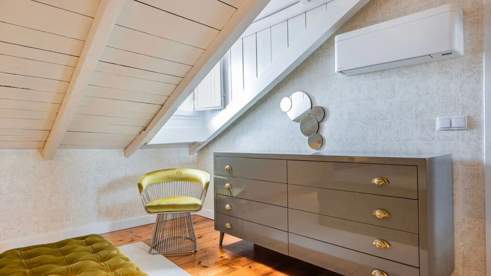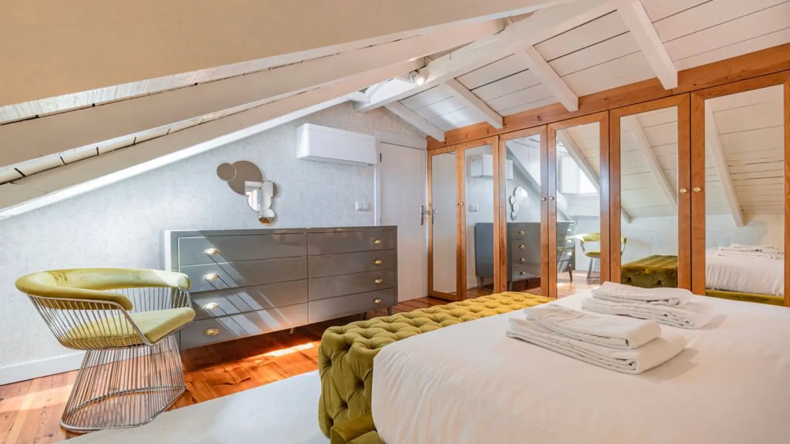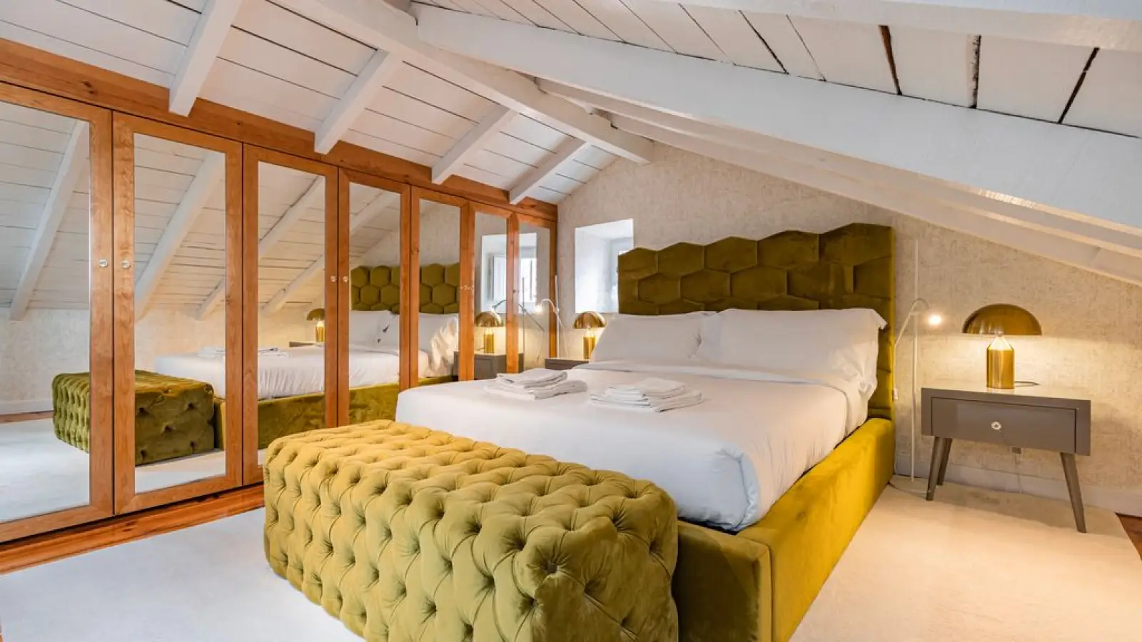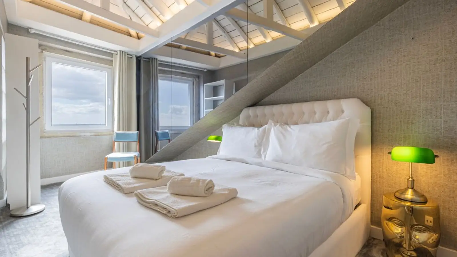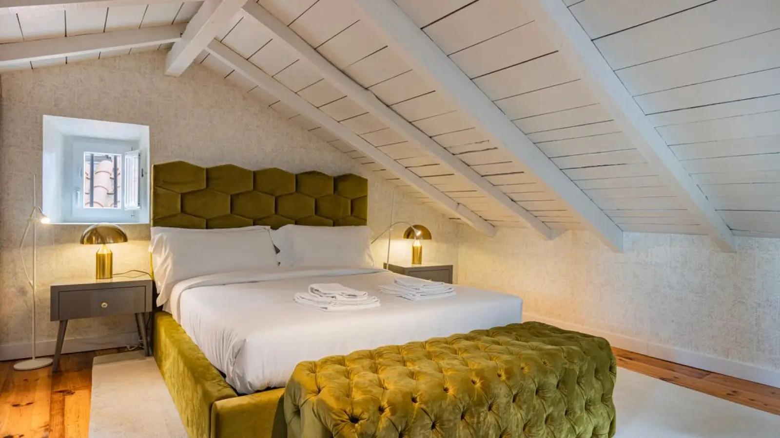 Master-Suite im Obergeschoss – Queensize-Bett, großzügiger Kleiderschrank, sanftes Tageslicht und ein stilvolles Badezimmer en suite mit besonderem Design.