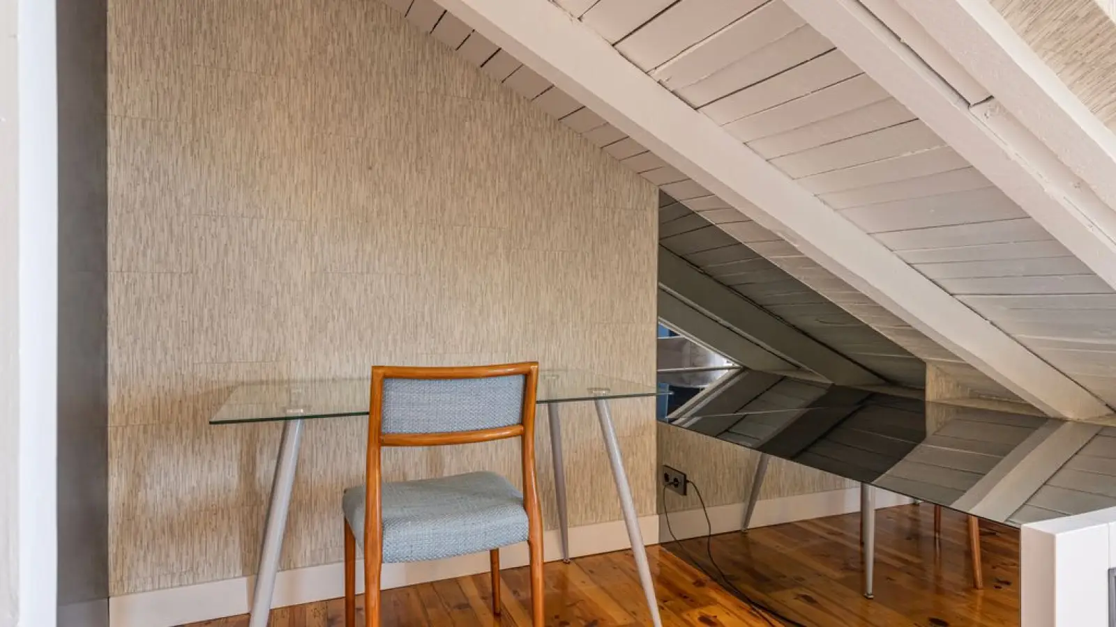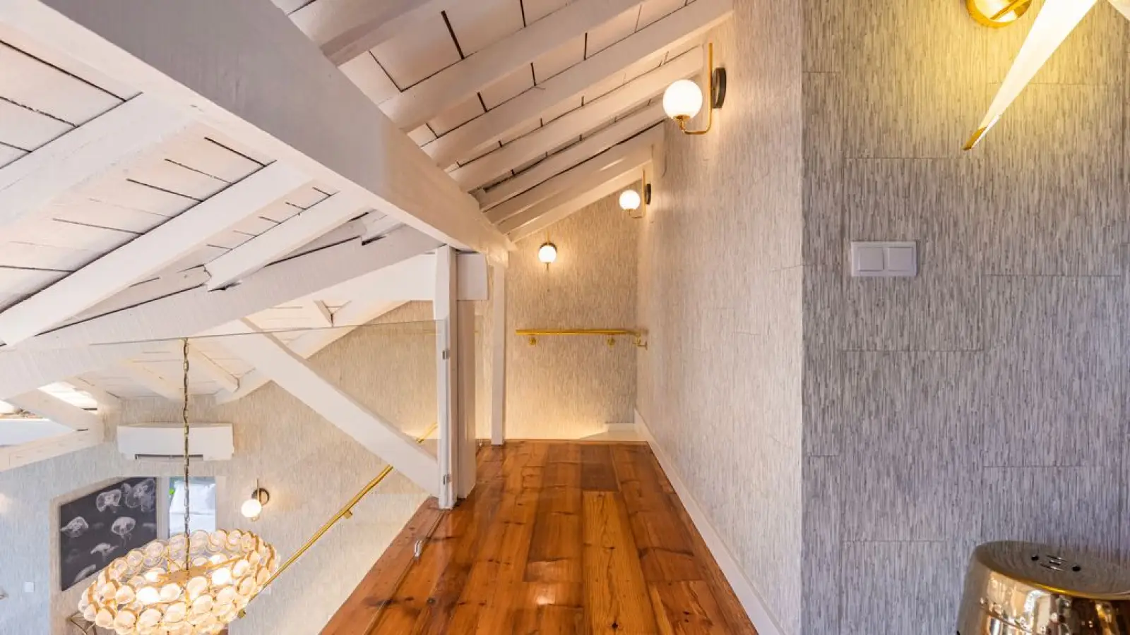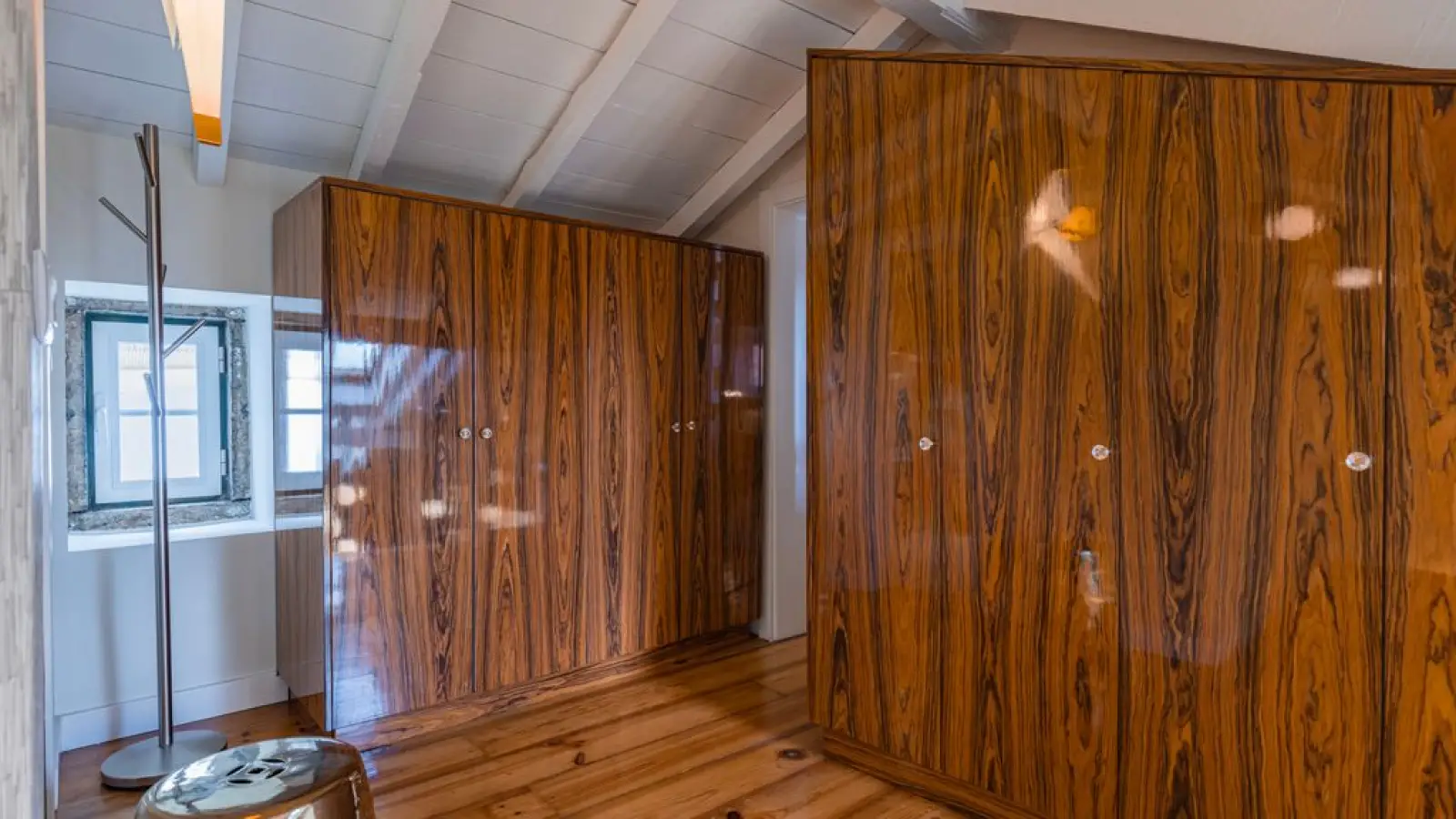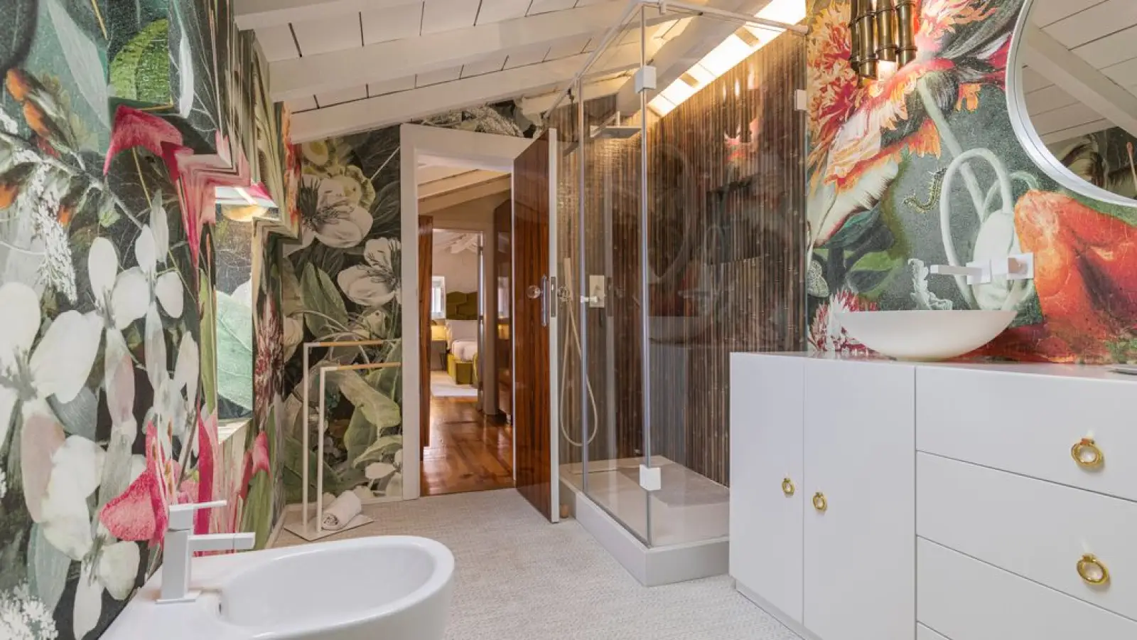 Master-Suite im Obergeschoss – Queensize-Bett, großzügiger Kleiderschrank, sanftes Tageslicht und ein stilvolles Badezimmer en suite mit besonderem Design.