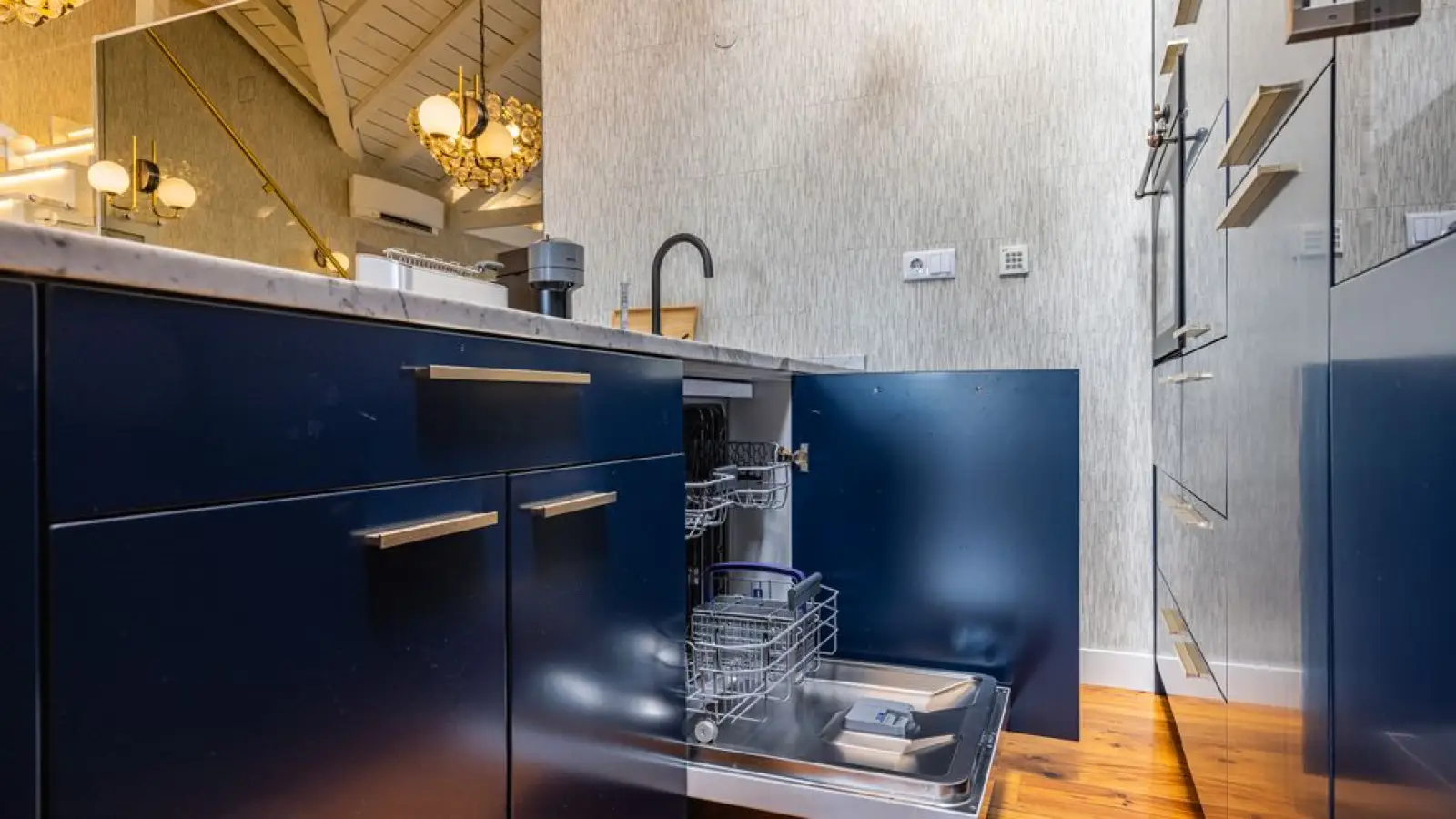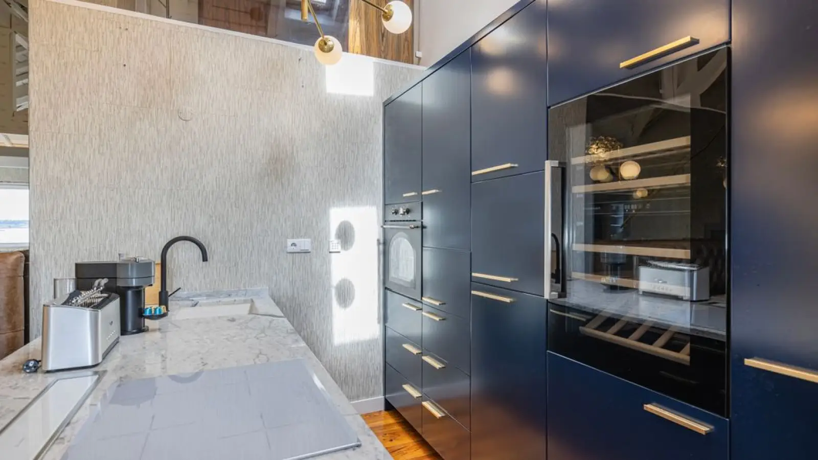 Moderne Küchenzeile: Elegante dunkle Schränke und minimalistisches Design, komplett ausgestattet mit hochwertigen Geräten für müheloses Kochen.