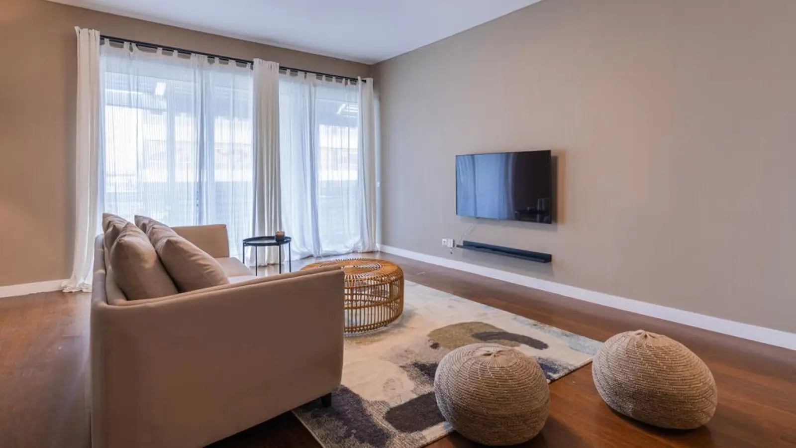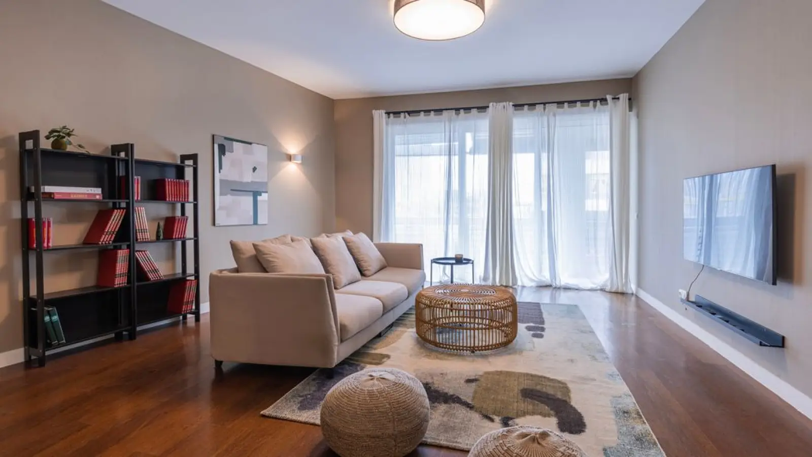 Großzügiges und einladendes Wohnzimmer in sanften, beruhigenden Farbtönen