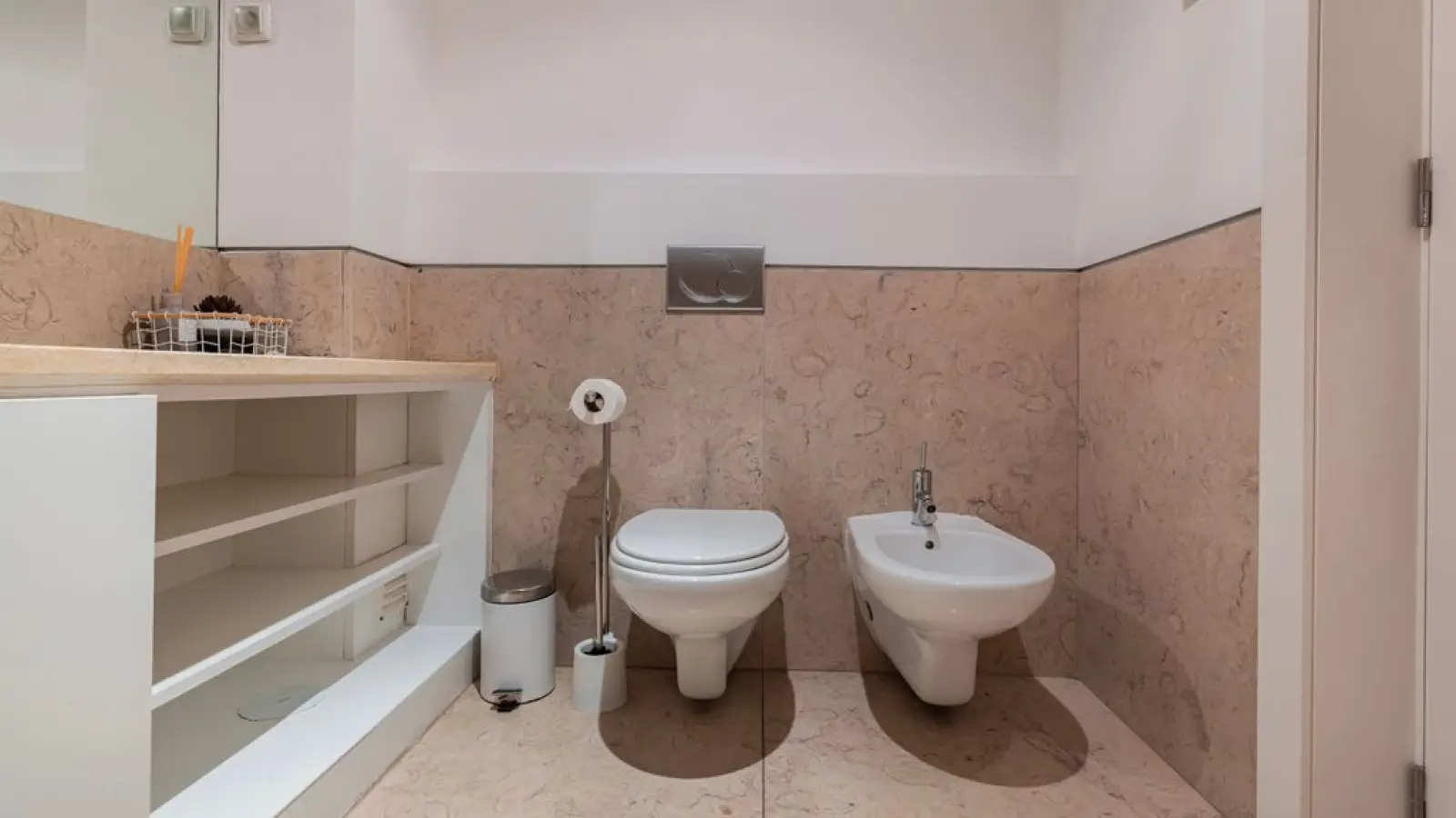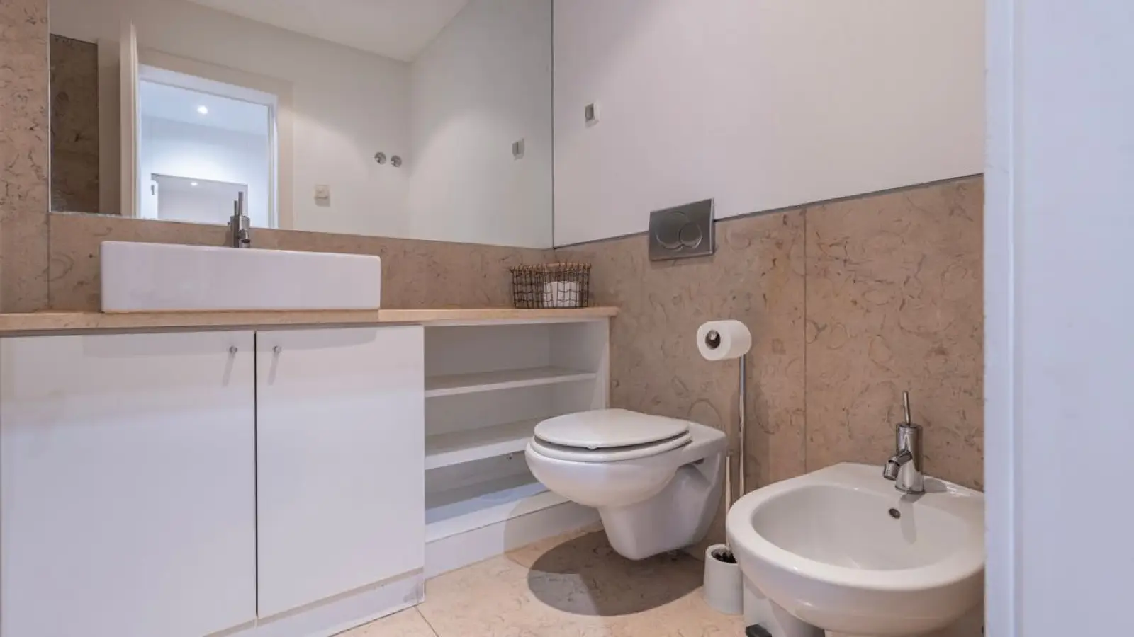 Zwei Badezimmer mit ebenerdiger Dusche, großem Spiegel und WC
