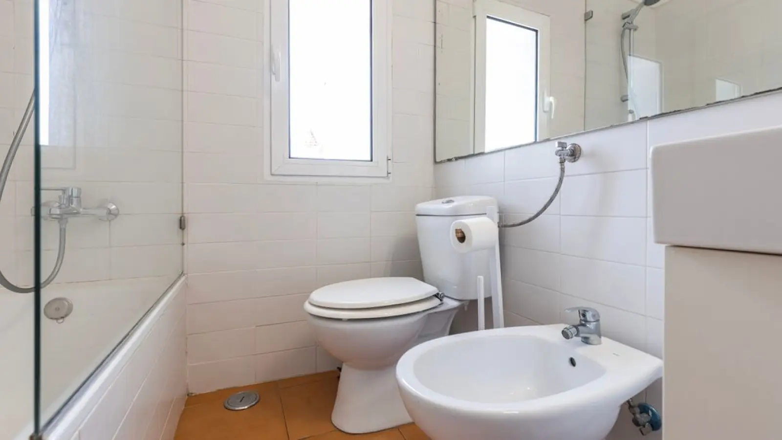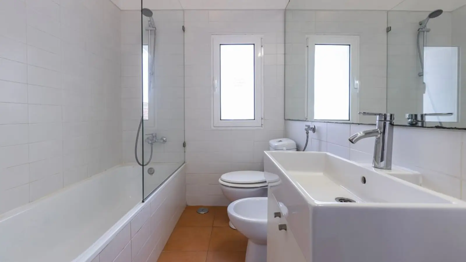 WC, Bidet, Waschbecken und großer Spiegel