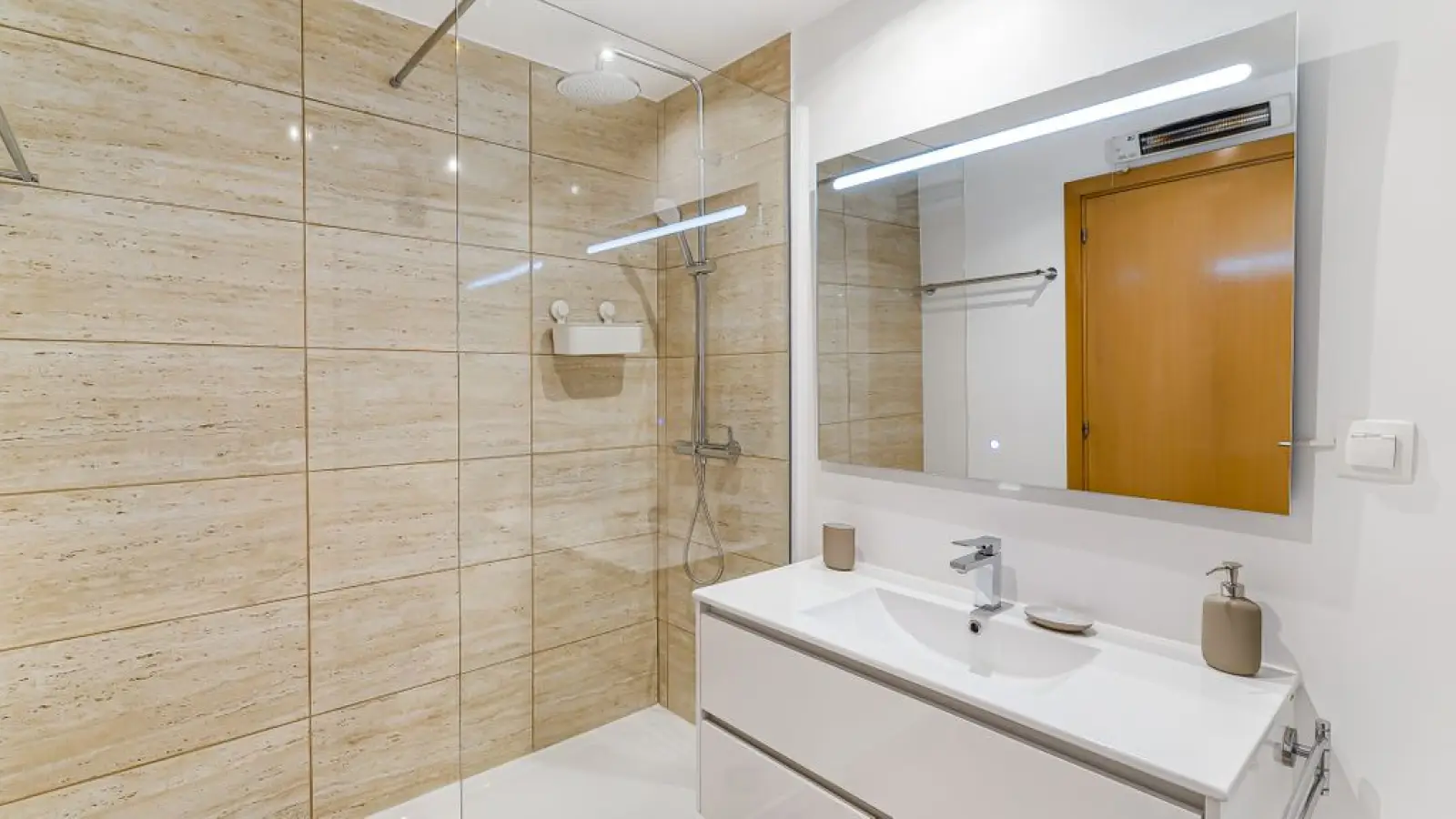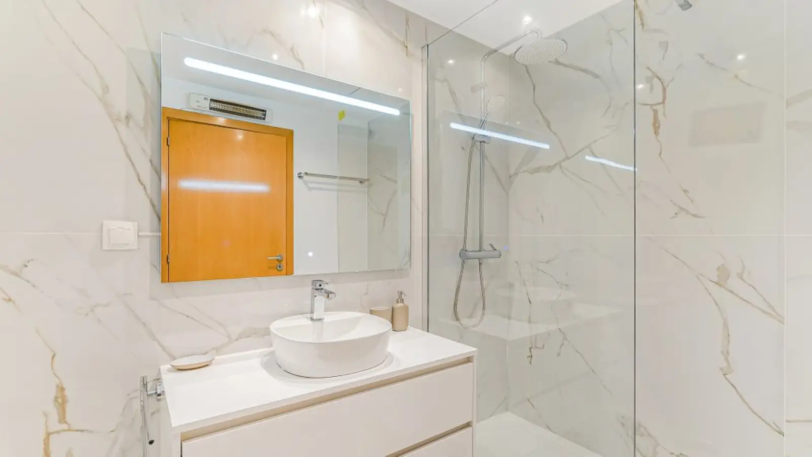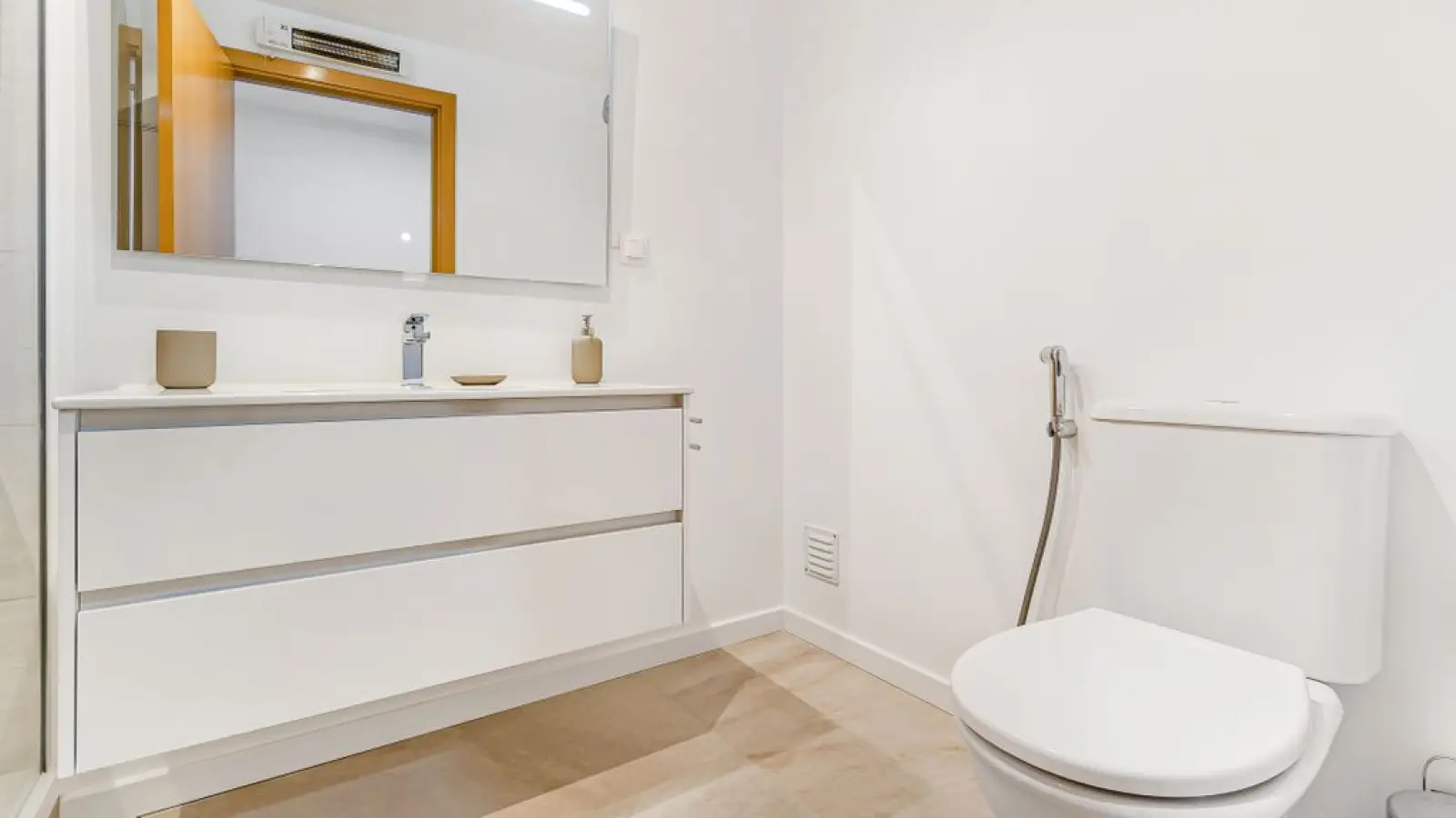 1 Badezimmer en suite mit Dusche, großem Spiegel, WC und Föhn.