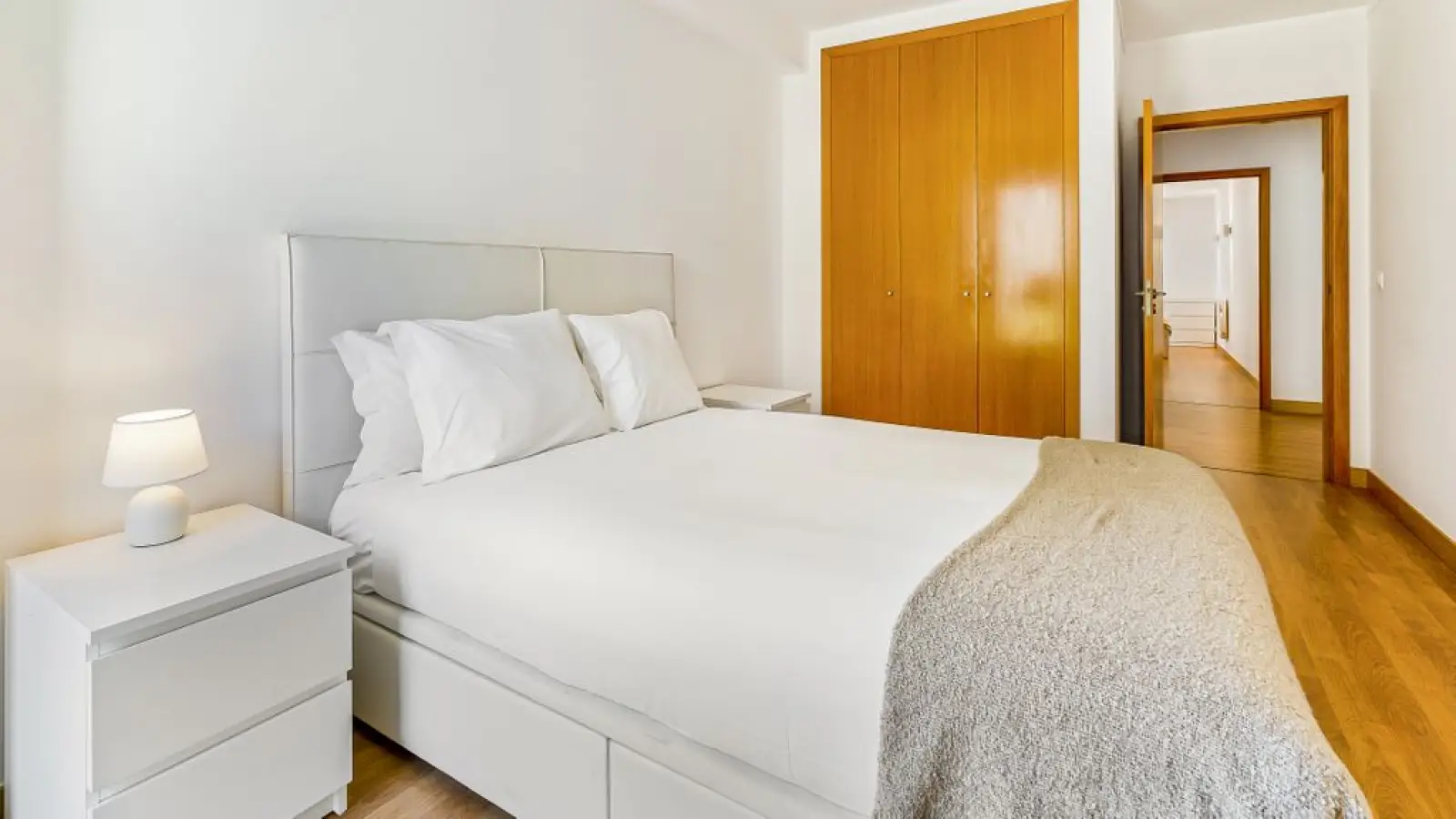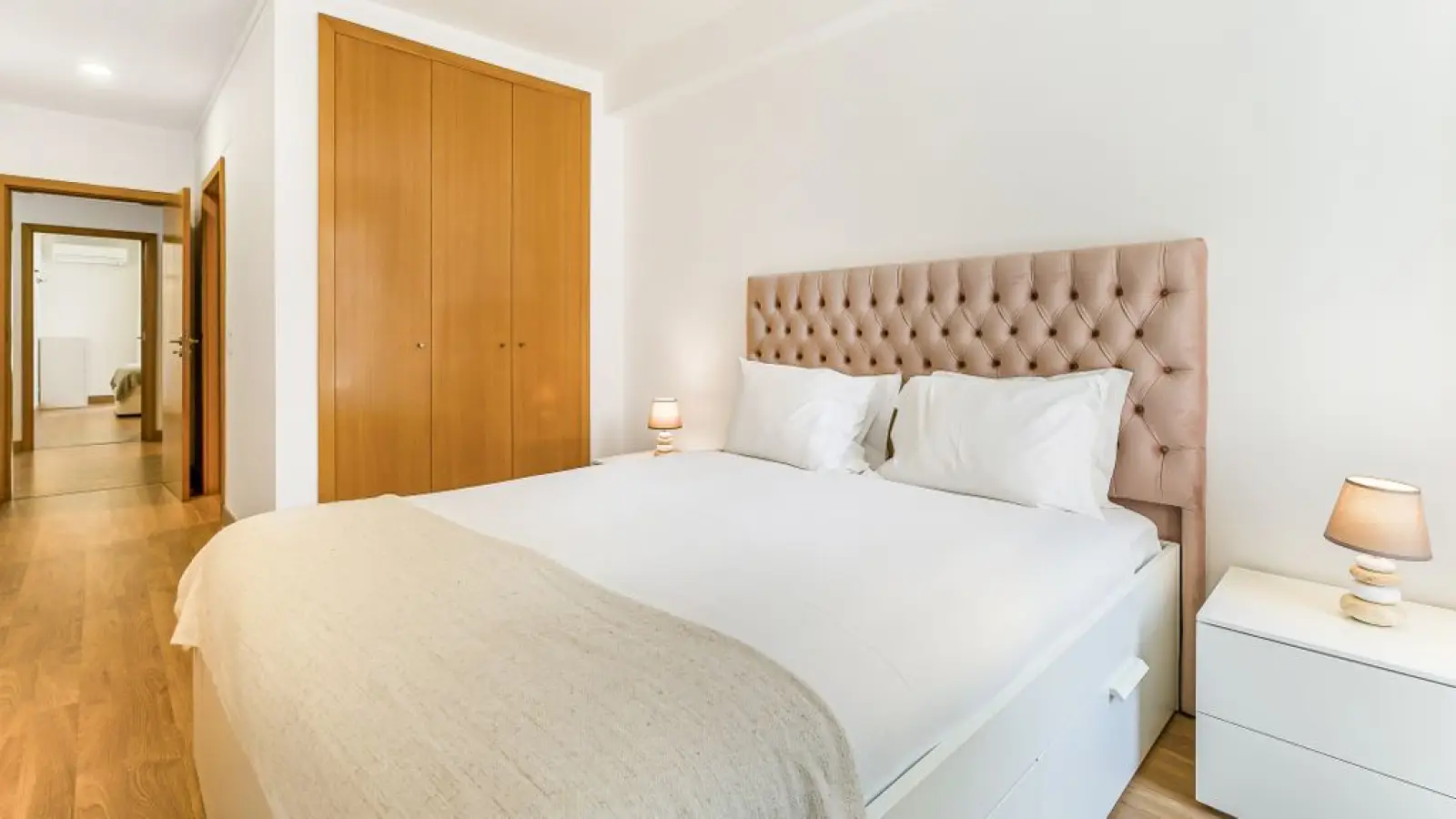 1 Schlafzimmer mit einem Queensize-Bett, 2 großen Kissen, hochwertiger Bettwäsche und Kleiderschrank.
