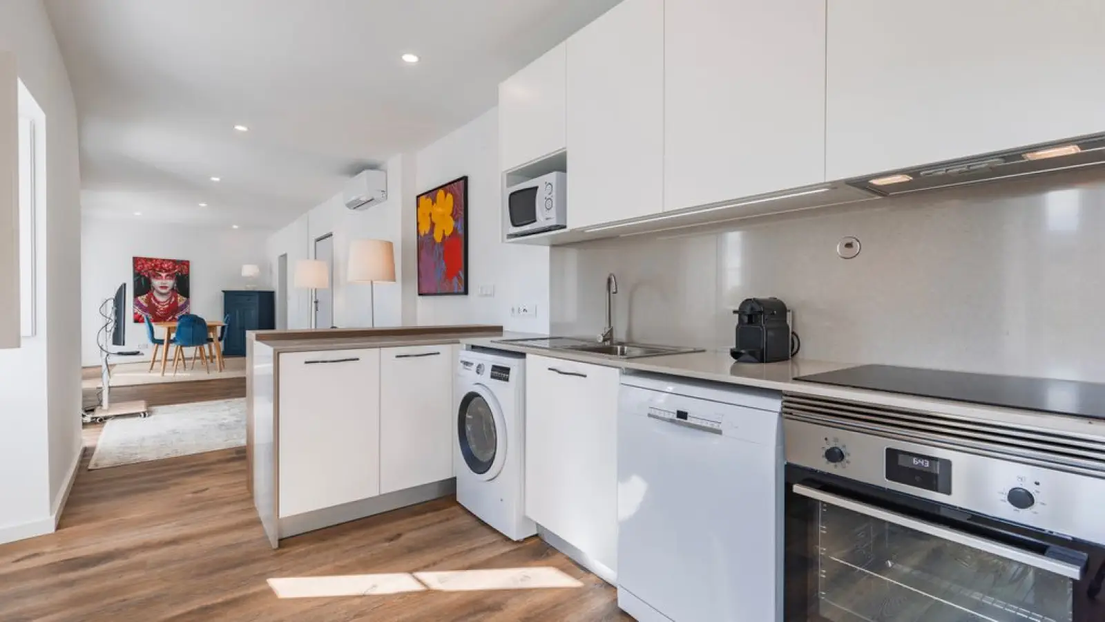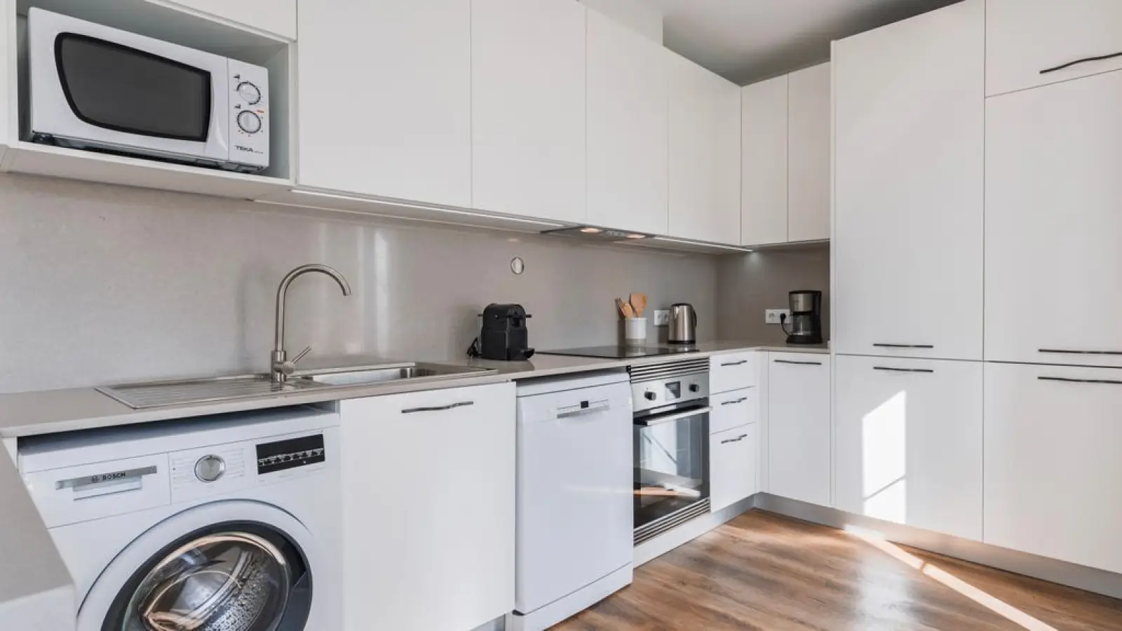 Die offene Küche ist ausgestattet mit Kühlschrank, Mikrowelle, Backofen, Gefrierschrank, Geschirrspüler, Geschirr/Besteck, Küchenutensilien, Kaffeemaschine, Toaster, Wasserkocher und Entsafter.