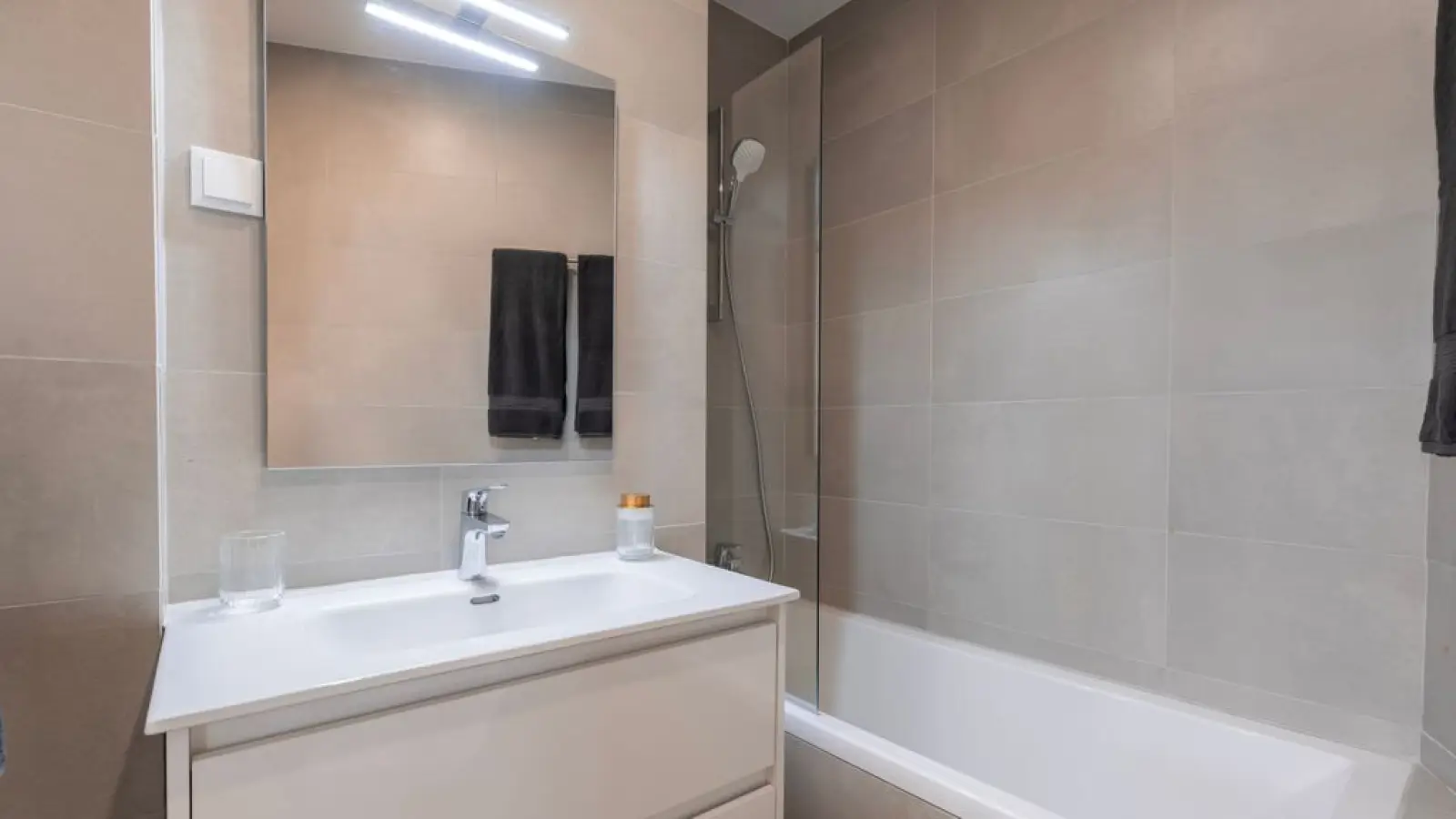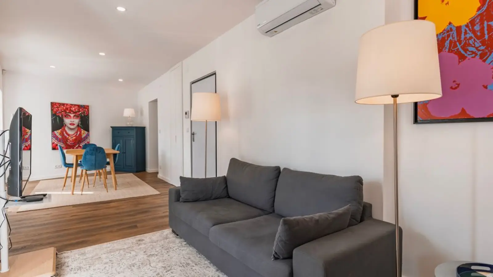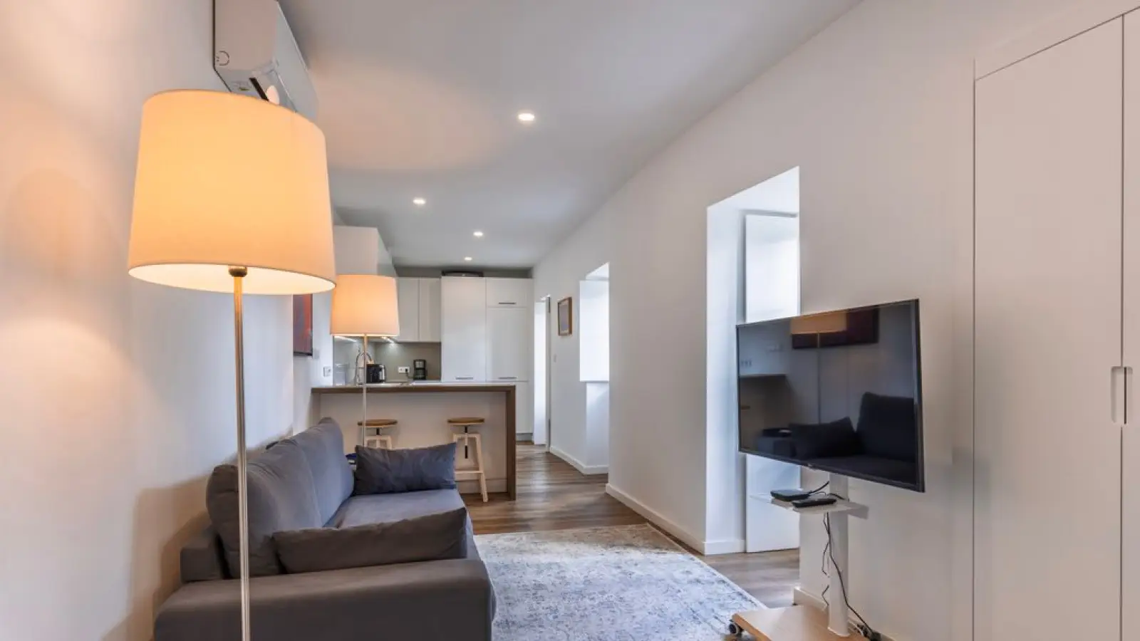 Zur Ausstattung gehören: Waschmaschine, Bügeleisen, Klimaanlage und TV.