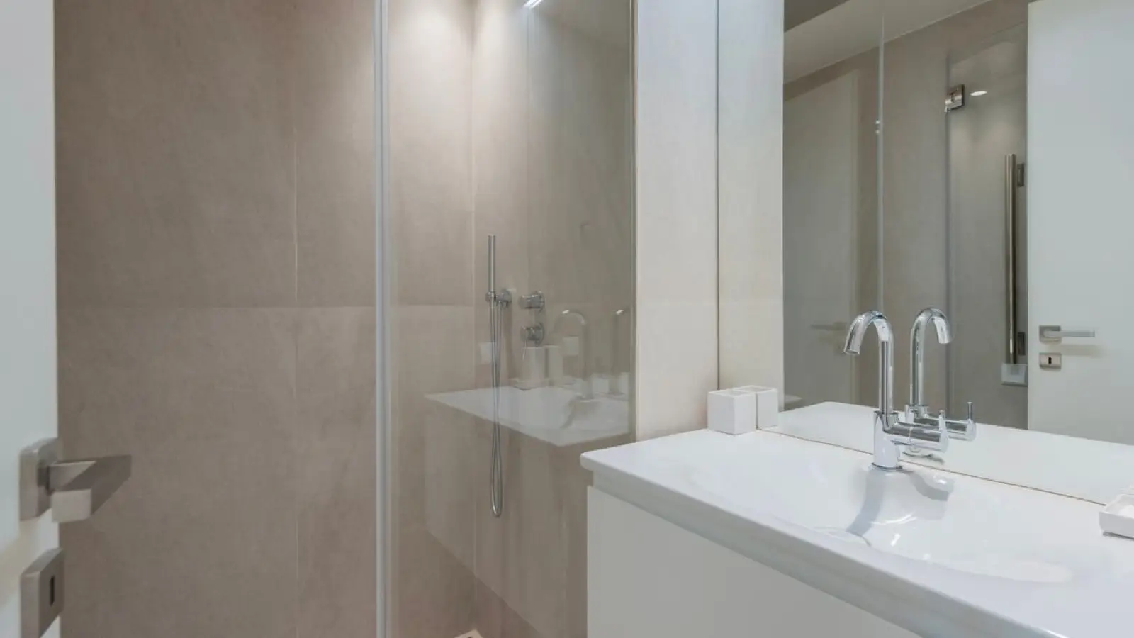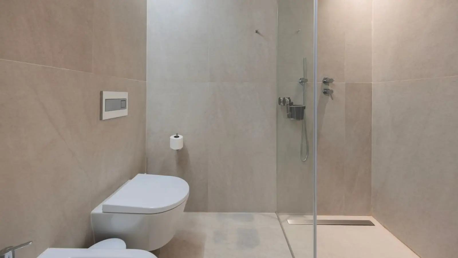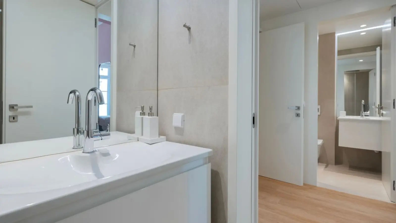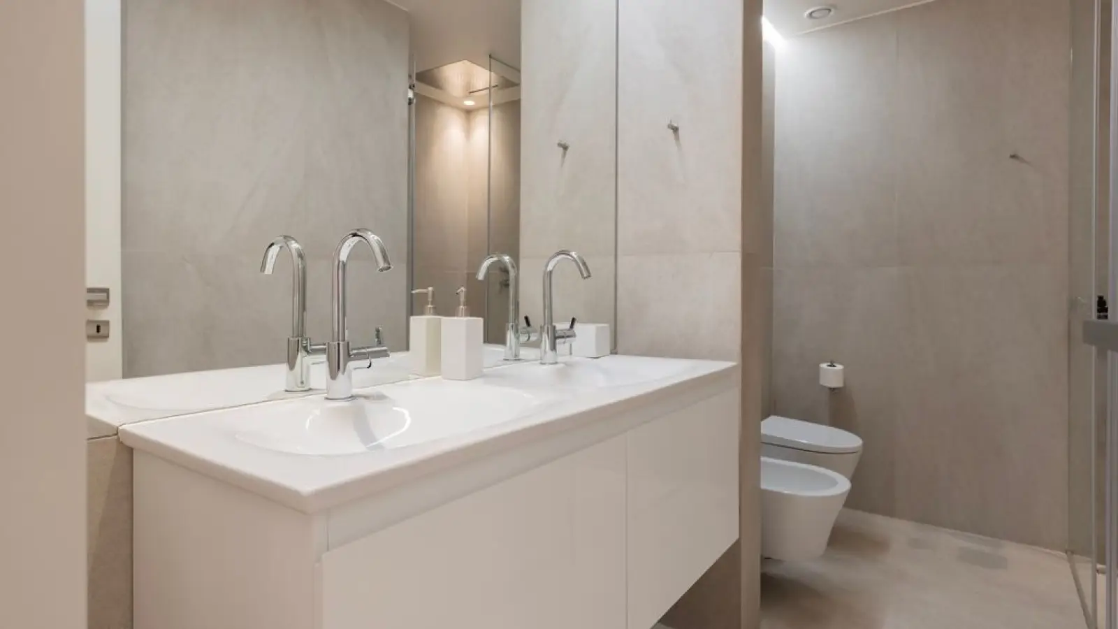 Die Wohnung verfügt über 2,5 moderne Badezimmer mit großen Spiegeln, WC, Waschbecken, Bidet, Dusche und Haartrockner.