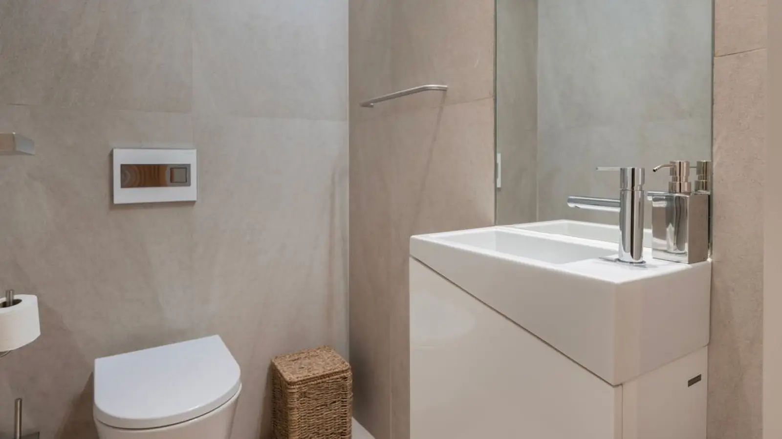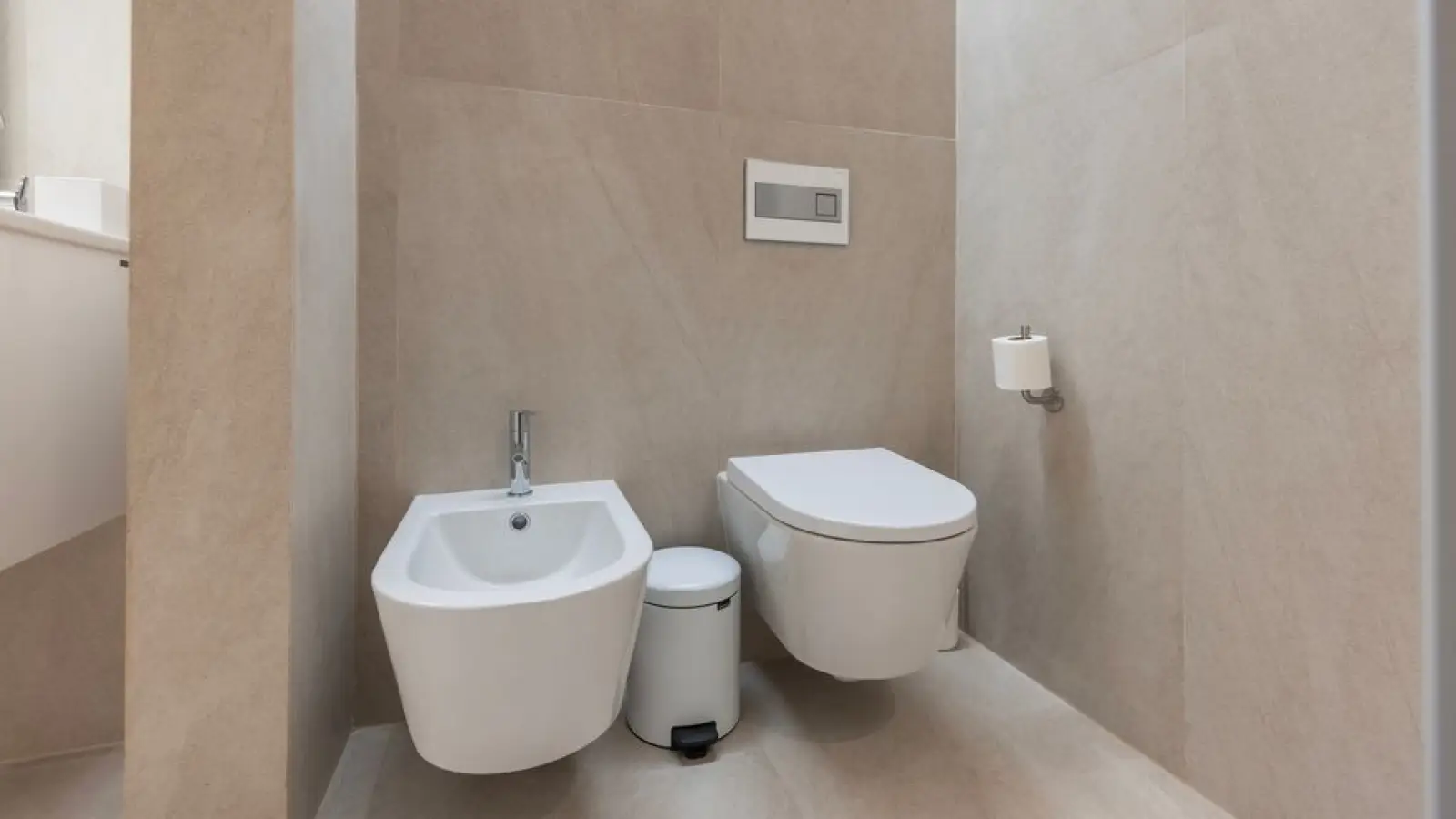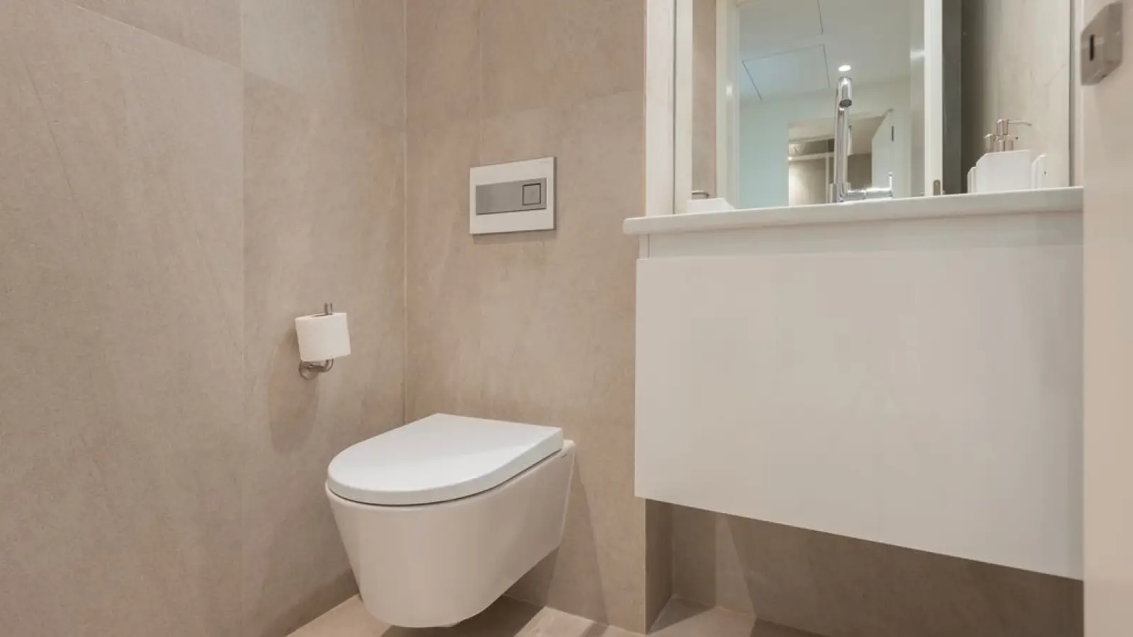 Die Wohnung verfügt über 2,5 moderne Badezimmer mit großen Spiegeln, WC, Waschbecken, Bidet, Dusche und Haartrockner.