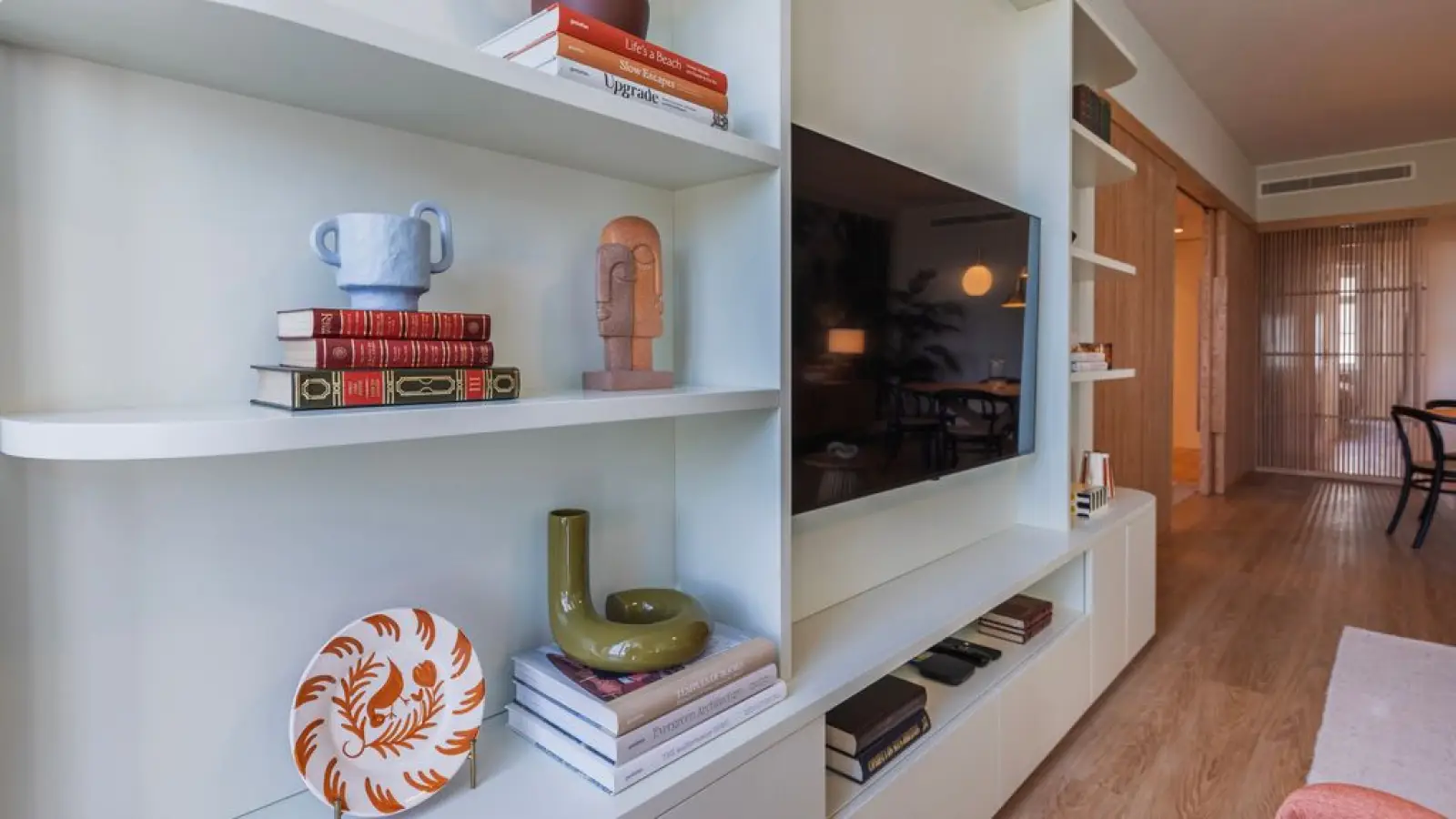 Das Apartment verfügt über einen großzügigen Wohnbereich mit einer komfortablen Sitzecke und einem Smart-TV.