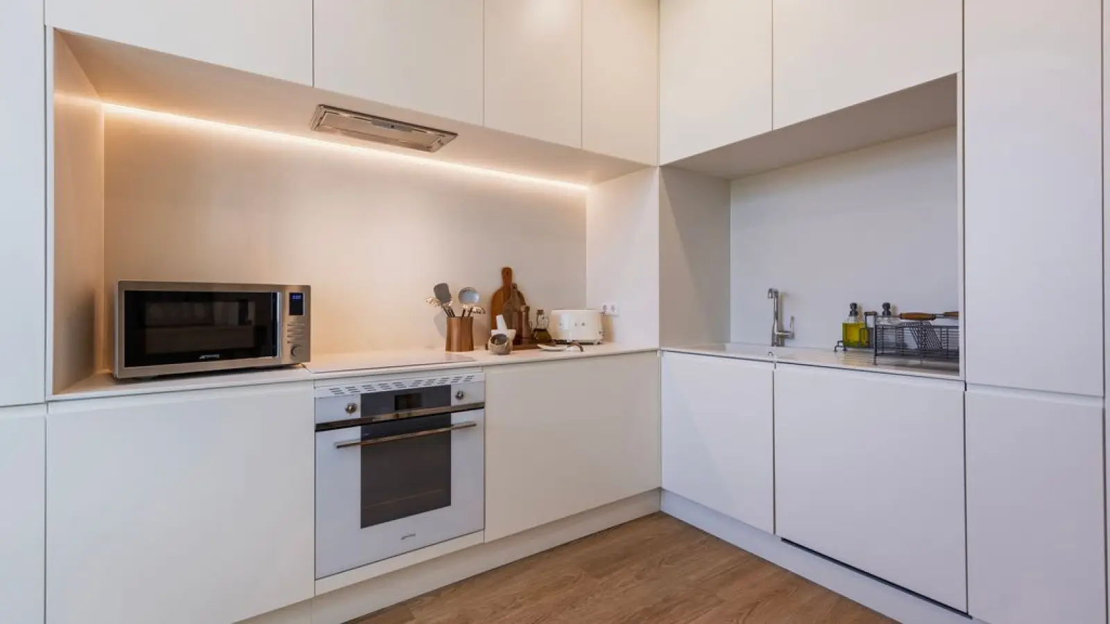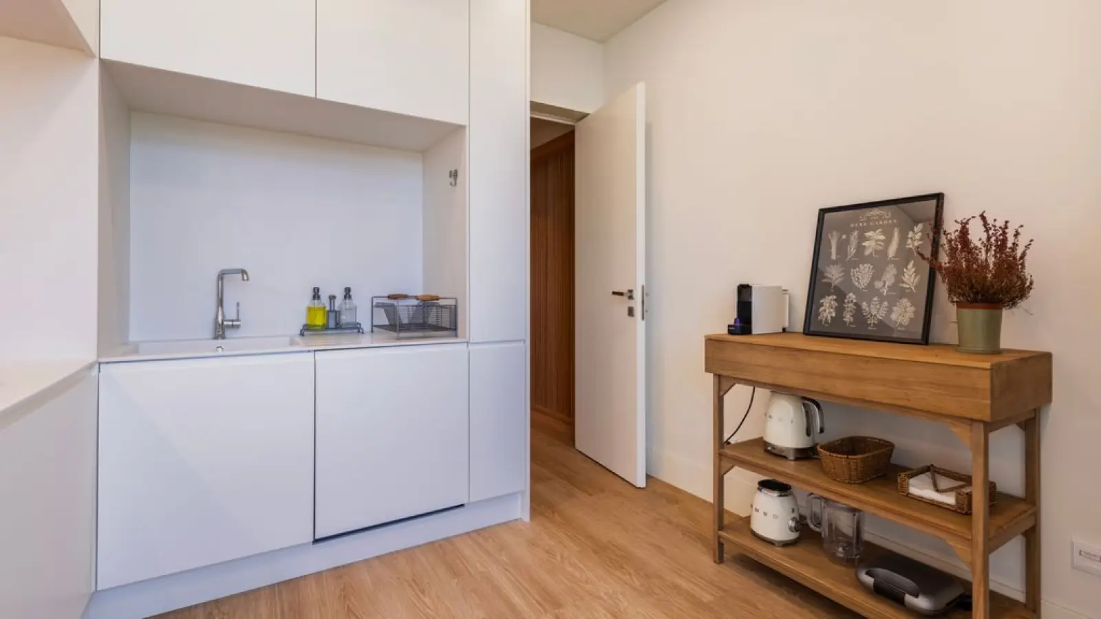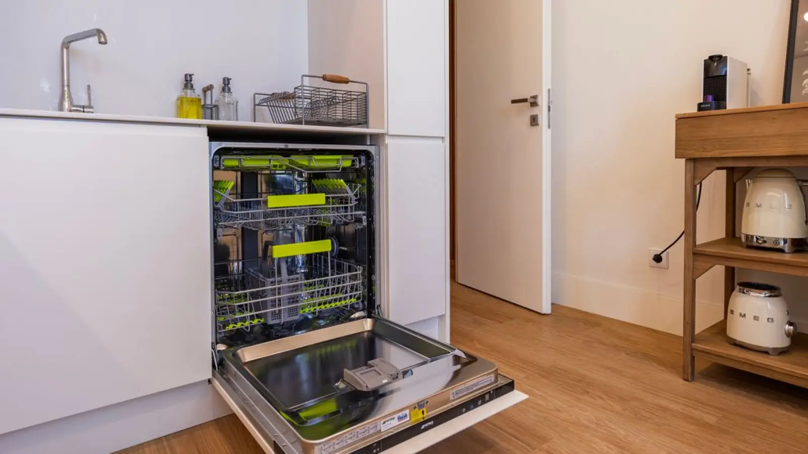Die Küche ist komplett ausgestattet mit allen Geräten und Utensilien, die Sie während Ihres Aufenthalts benötigen, darunter ein Wasserkocher, ein Backofen mit Herd, ein großer Kühlschrank, ein Geschirrspüler und eine Kapselkaffeemaschine.