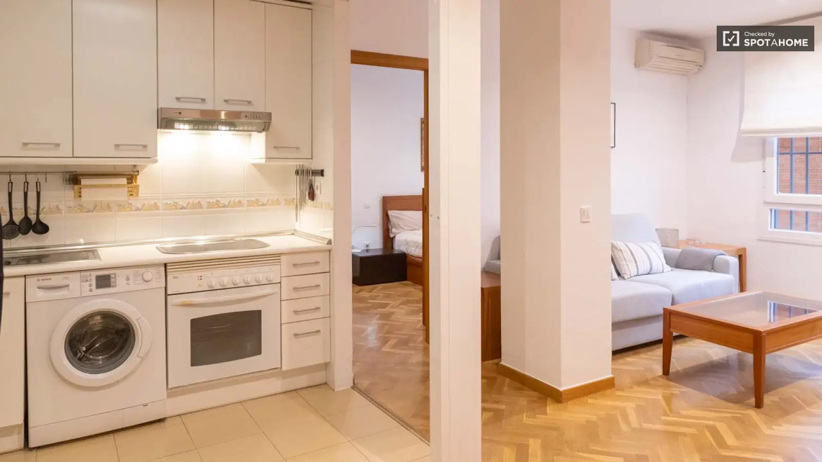 Betreten Sie dieses charmante, komplett möblierte 1-Zimmer-Apartment in Acacias, Madrid. Die Wohnung ist in einem tadellosen Zustand und verfügt über eine eigene Waschmaschine, einen Geschirrspüler und individuell regulierbare Klimaanlagen. Die Küche ist voll ausgestattet und funktional, und zur Ausstattung gehören moderne Annehmlichkeiten wie ein Fernseher. Das Gebäude ist mit einem Aufzug ausgestattet, was den Zugang erleichtert. Mieter haben außerdem Zugang zu einem Swimmingpool. Dieses Apartment wurde von Spotahome persönlich geprüft.