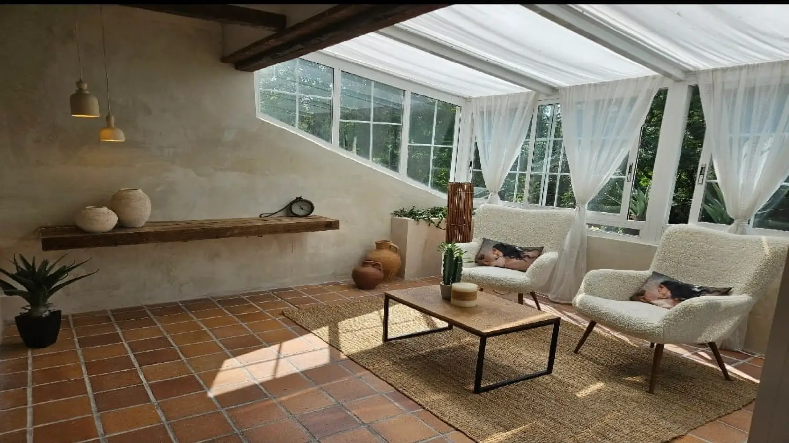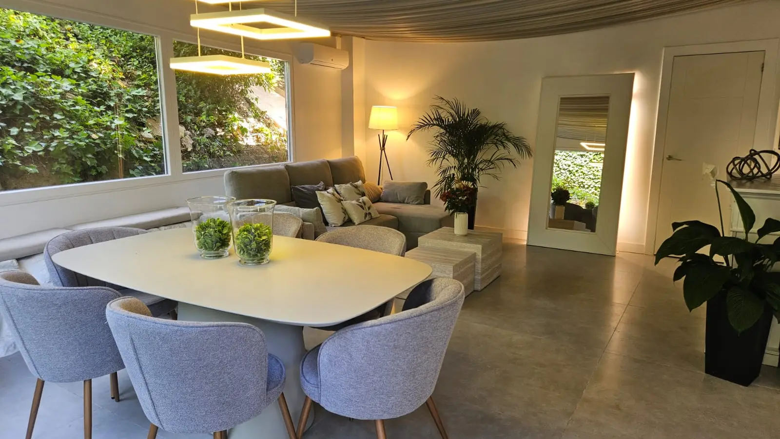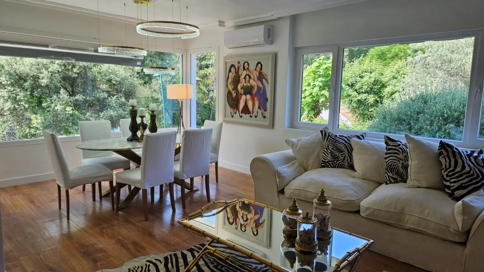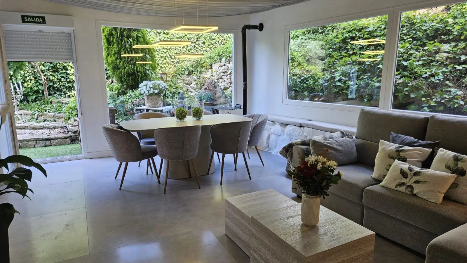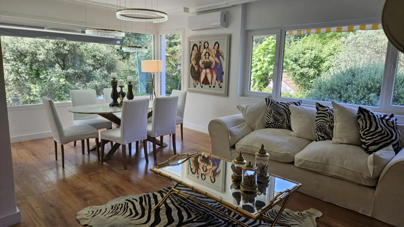 Im Inneren finden Sie ein komfortables Wohnzimmer im französischen Stil mit avantgardistischer Dekoration, Kristallleuchtern, antiken Möbeln und einem hellen Wintergarten als Gästeeingang.