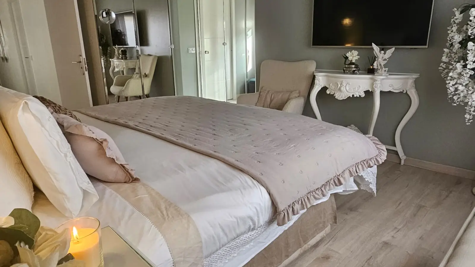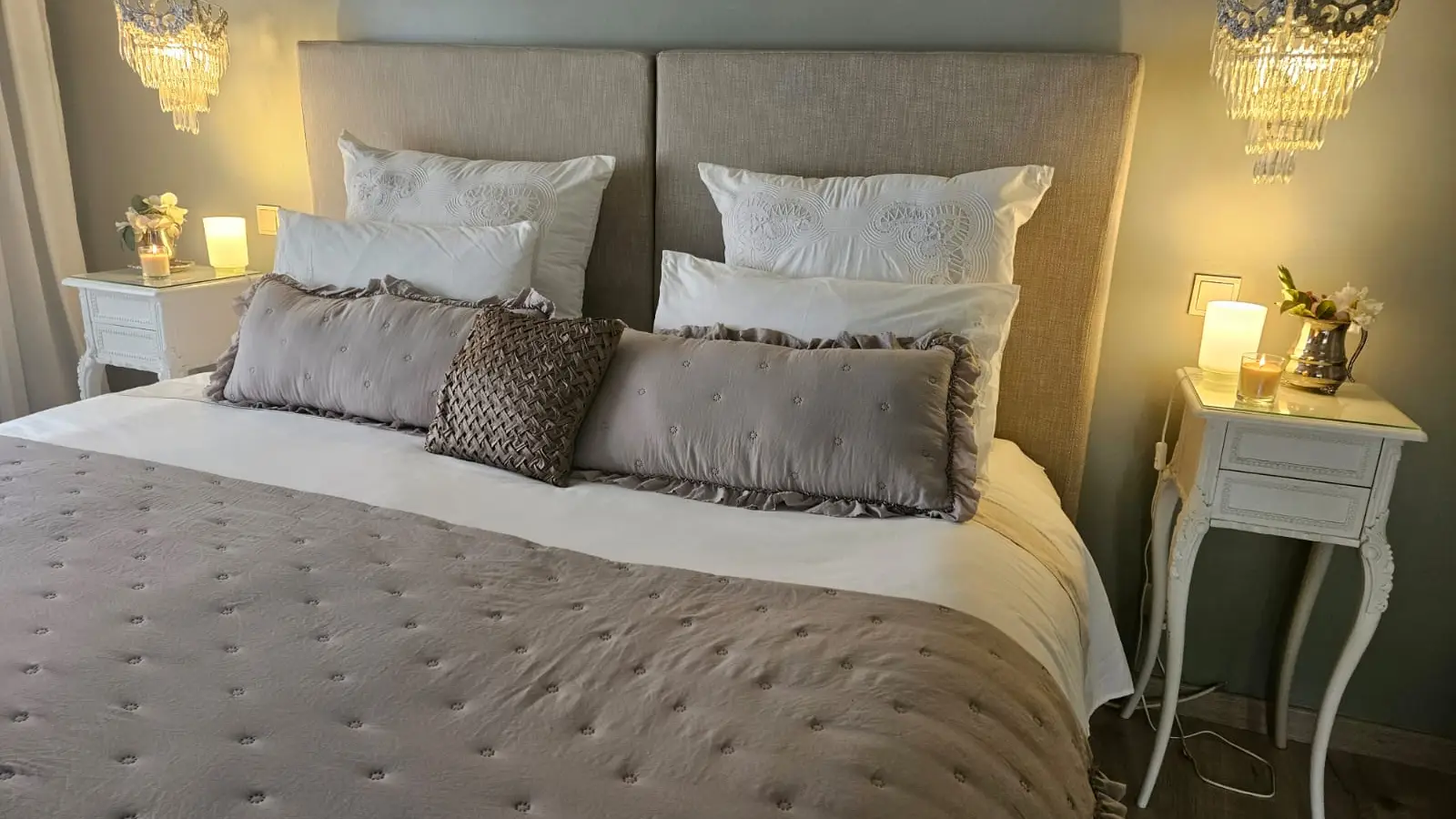 Das Hauptschlafzimmer (Schlafzimmer 1) umfasst ein eigenes Badezimmer und eine Whirlpool-Badewanne sowie ein geräumiges Doppelbett von 2 x 2 m mit Blick auf den Garten und den Swimmingpool