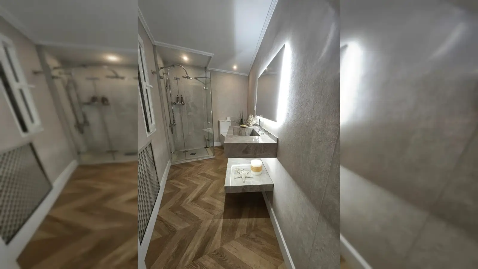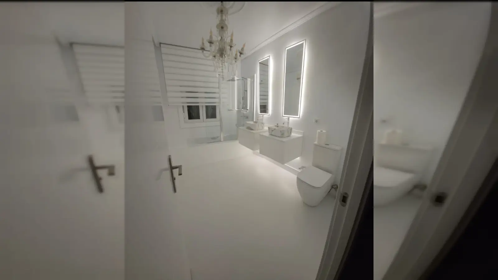 Das Anwesen umfasst insgesamt drei komplette Badezimmer (eines im Erdgeschoss, zwei im letzten Stock, darunter ein gemeinsames und ein eigenes Badezimmer).