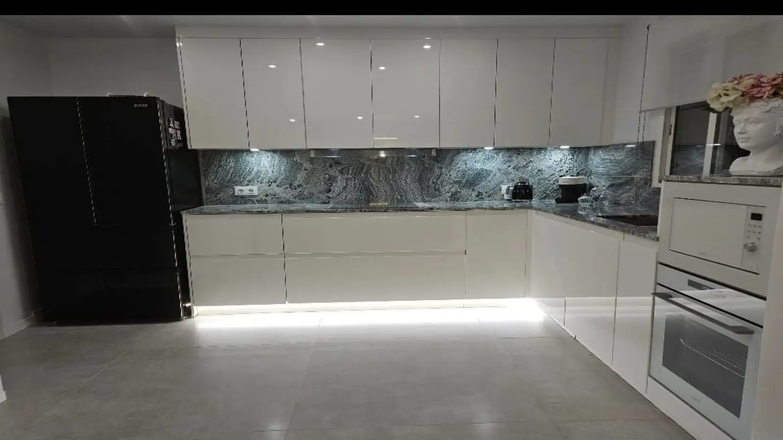 Die Küche im französischen Landhausstil ist mit schönen Sideboards und einem großen Doppelkühlschrank dekoriert, die mit den üblichen Regeln dieser Art von Räumen brechen, und kommuniziert direkt mit dem riesigen Wohnzimmer, das ein großes Schlafsofa enthält, von dem aus Sie viel vom Garten sehen können .