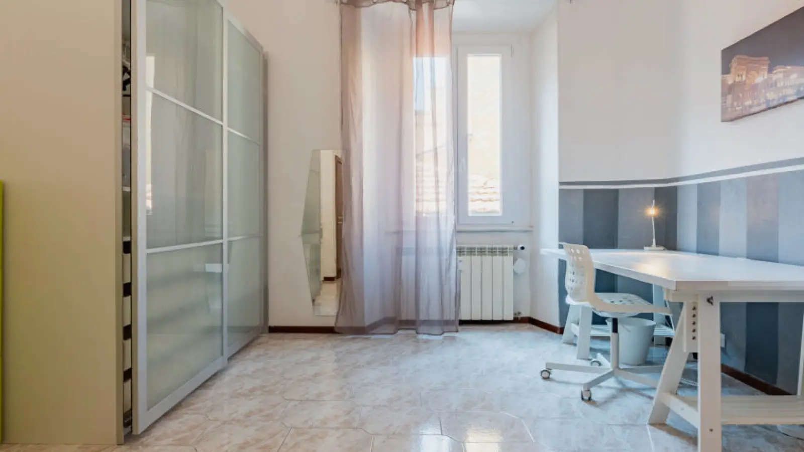 Weißes Zimmer mit TV in 4-Zimmer-Wohnung, Porta de Ticinese für Frauen (Mailand, Italien)