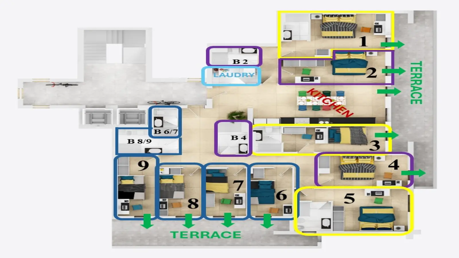 - Wöchentliche Reinigung der Gemeinschaftsbereiche im Mietpreis inbegriffen