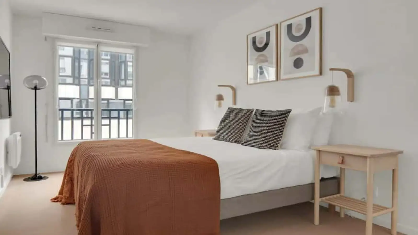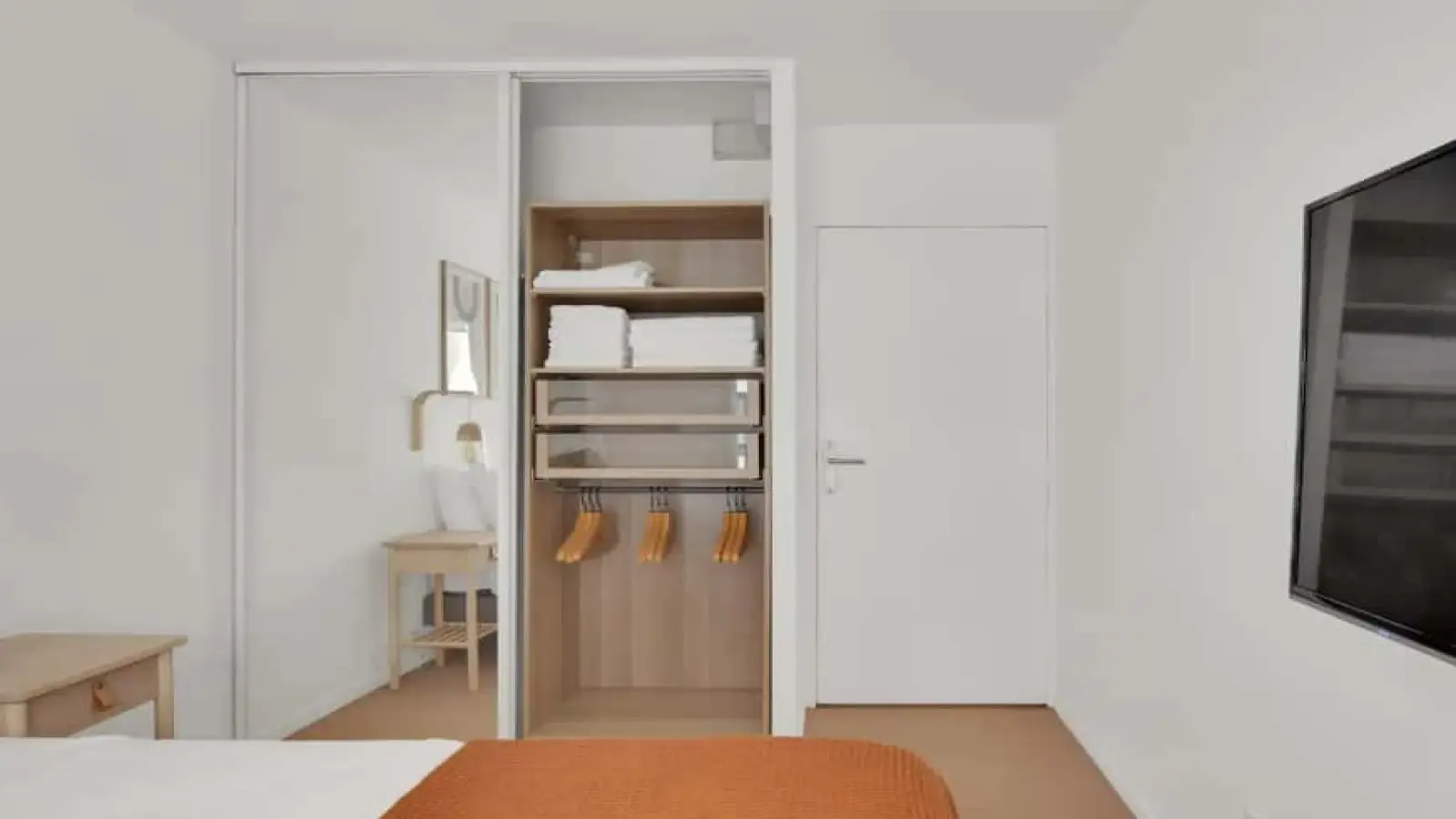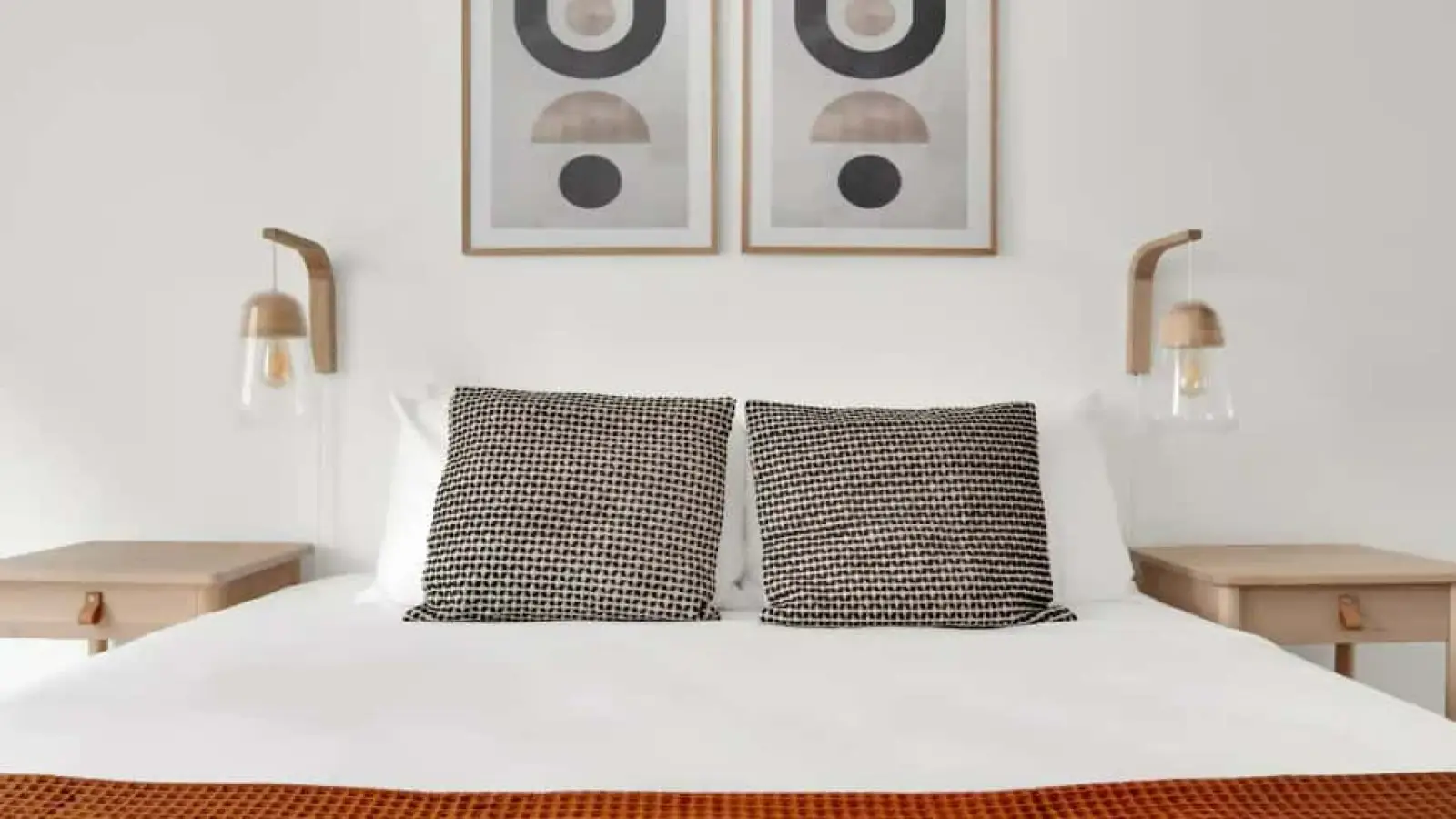 Die Unterkunft: Großzügige, moderne und helle 2-Zimmer-Wohnung mit einem Schlafzimmer mit Queensize-Bett, 4K-TV und Kleiderschrank sowie einem geräumigen Wohnzimmer mit Essbereich, Schreibtisch und Schlafcouch.