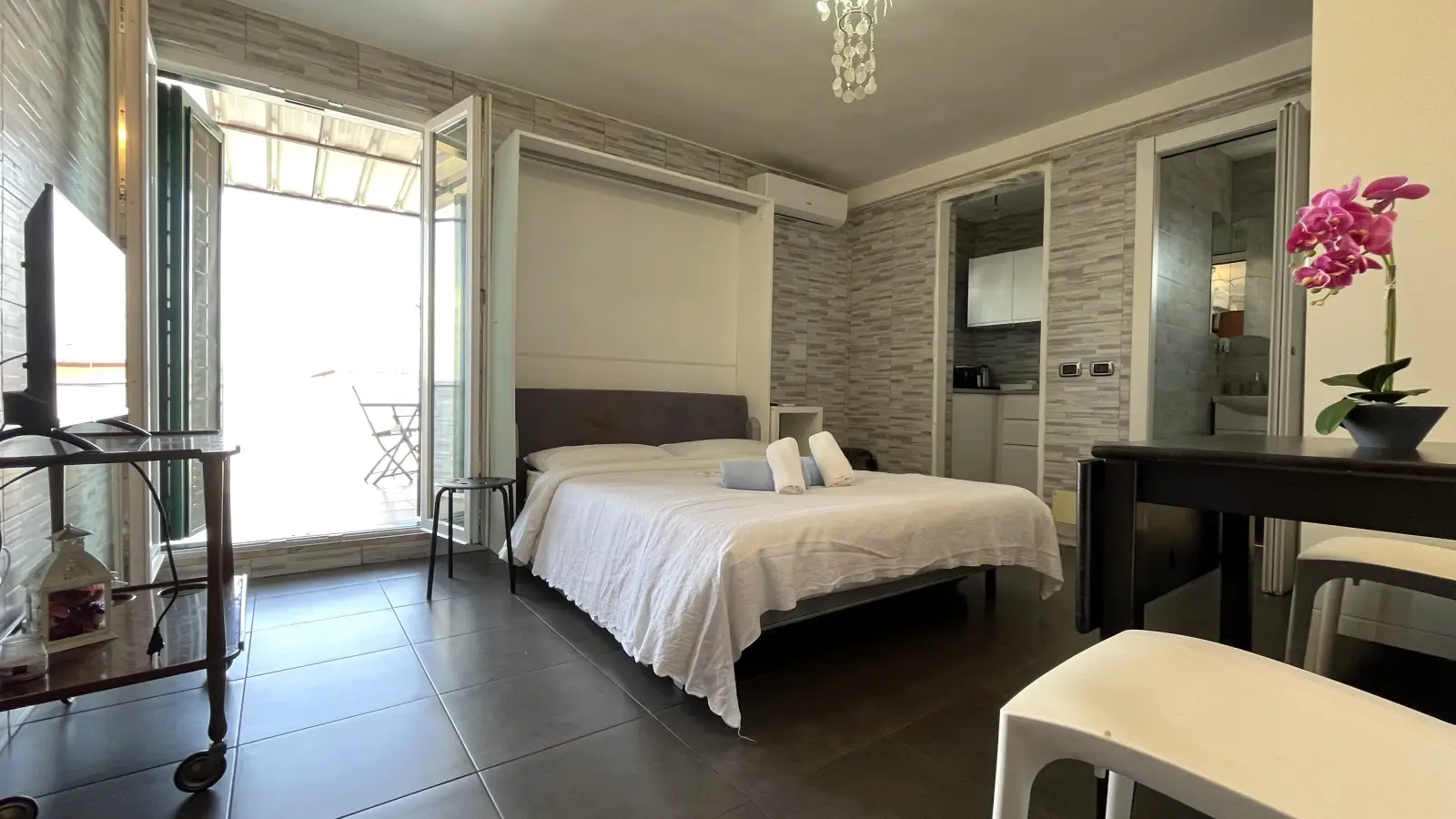 Entdecken Sie ein charmantes Studio zur Miete in Centocelle, Rom. Diese komplett möblierte Wohnung bietet eine voll ausgestattete Küche, einen Aufzug, eine Klimaanlage und einen Balkon oder eine Terrasse für ein gemütliches und praktisches Wohnerlebnis. Paare und Wohngemeinschaften sind in dieser wohnfreundlichen Umgebung herzlich willkommen.