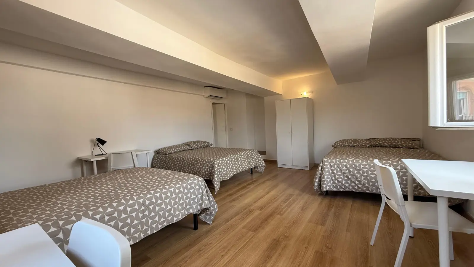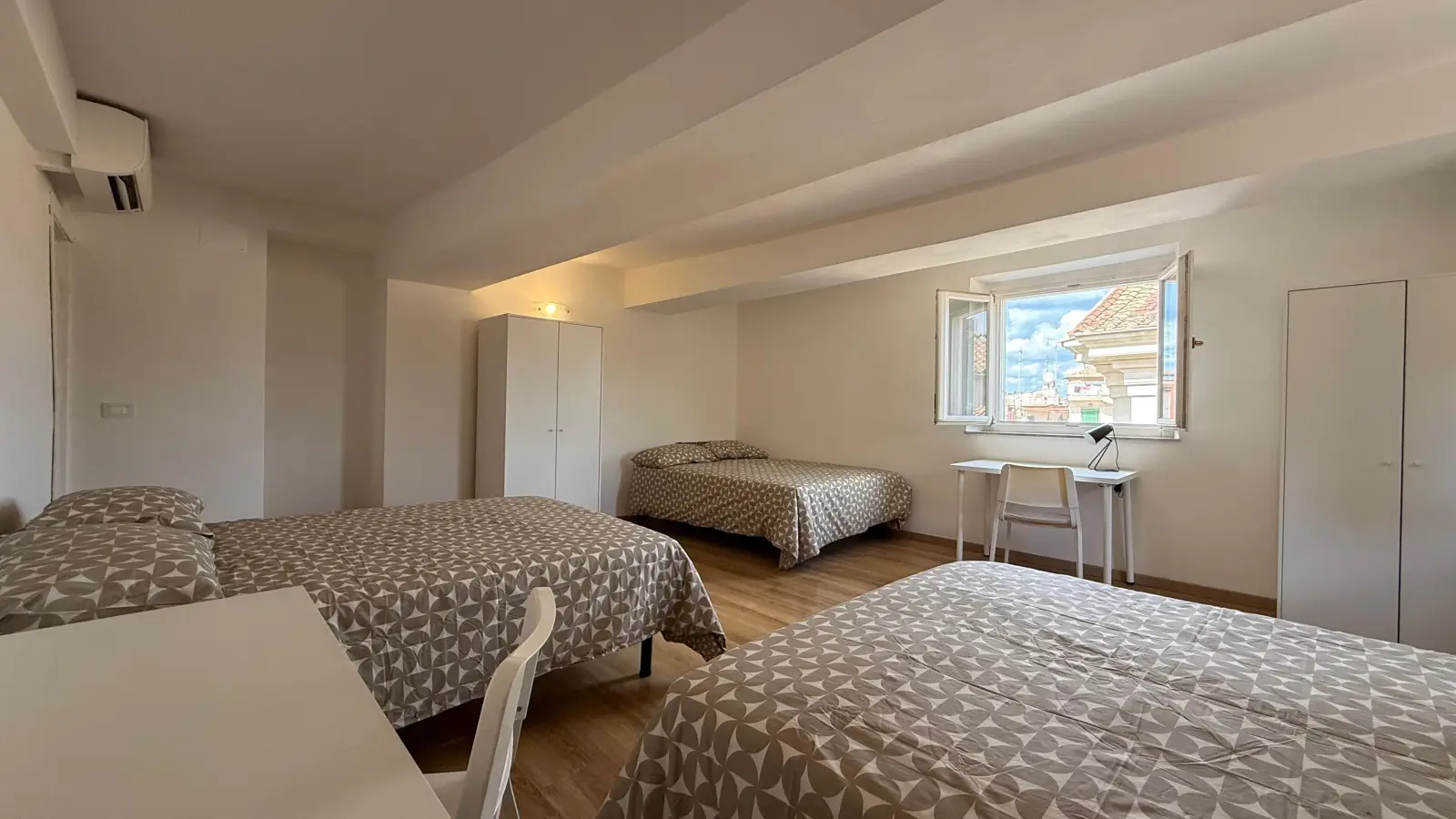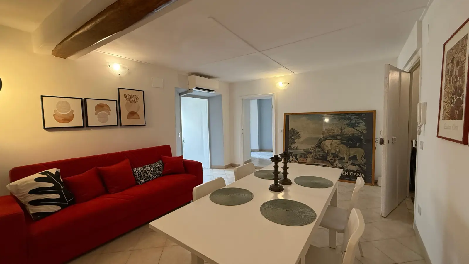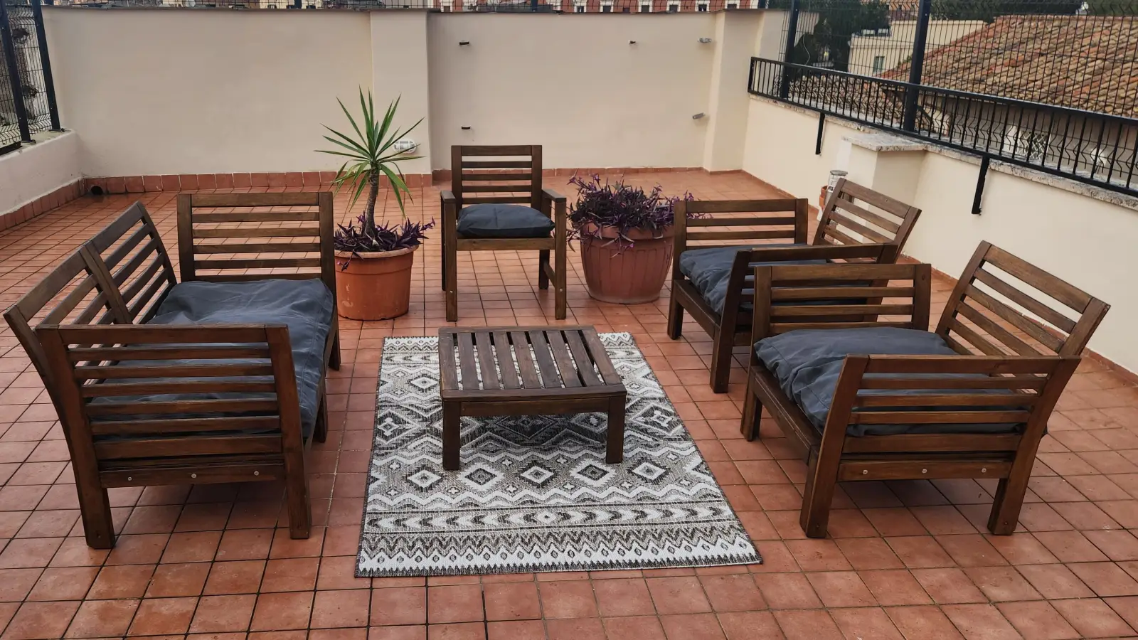Dieses Apartment an der Piazza Apollonia befindet sich im dritten Stock eines großen historischen Gebäudes. Diese klimatisierte Wohnung verfügt über eine große Terrasse, die nur den Mietern dieser Wohnung vorbehalten ist. Sie hat einen Grundriss auf zwei Ebenen mit drei sehr großen Schlafzimmern. Das Apartment ist für sieben Personen ausgelegt. Zwei der Zimmer sind mit zwei Einzelbetten ausgestattet und das dritte mit drei Einzelbetten. Es verfügt über zwei Badezimmer und eine Küche mit zwei Kühlschränken. Der Wohn-/Essbereich befindet sich in der Mitte des Grundrisses.