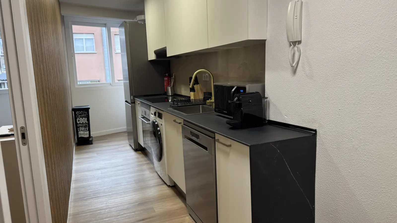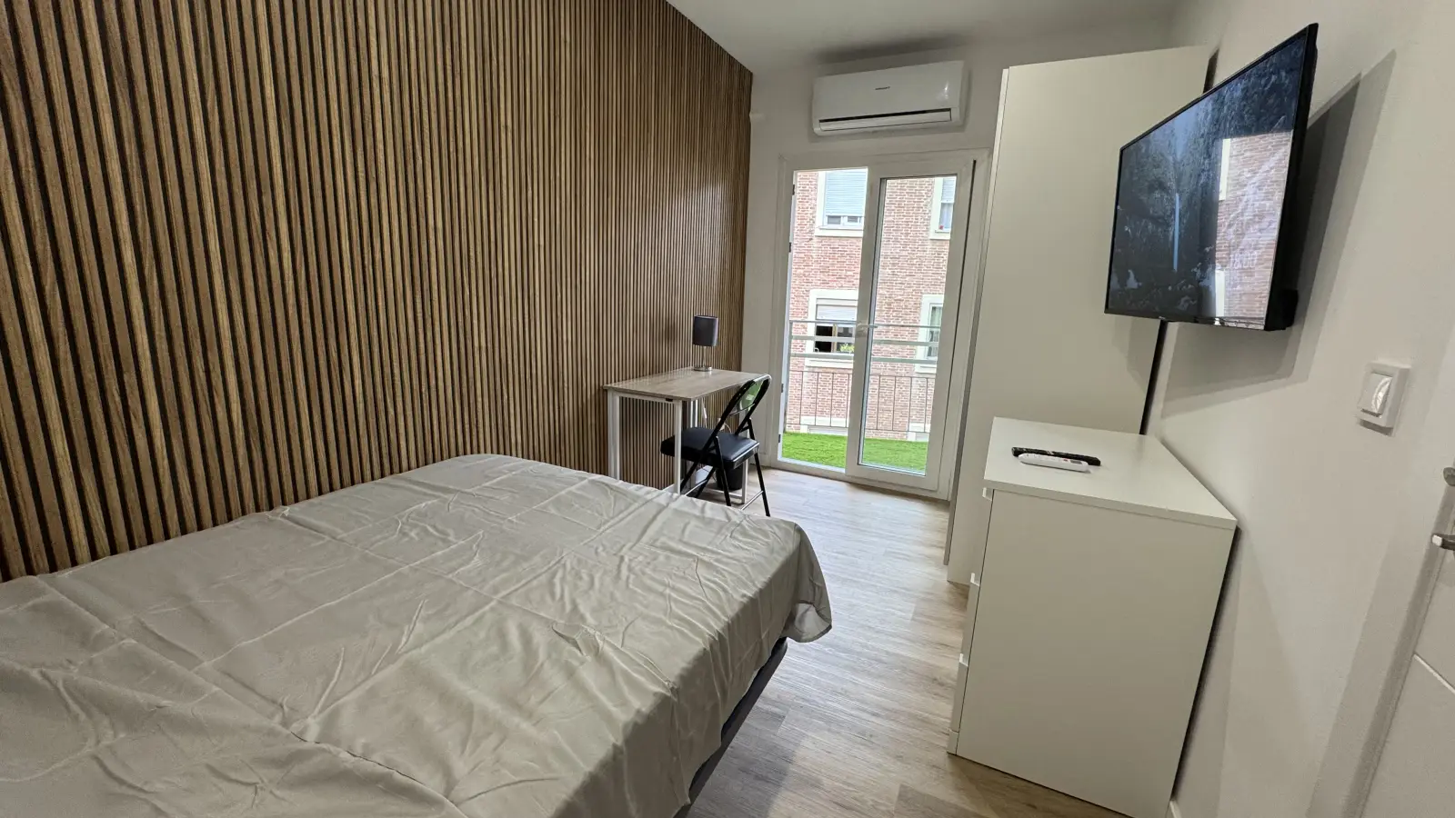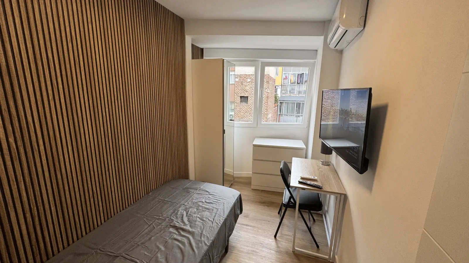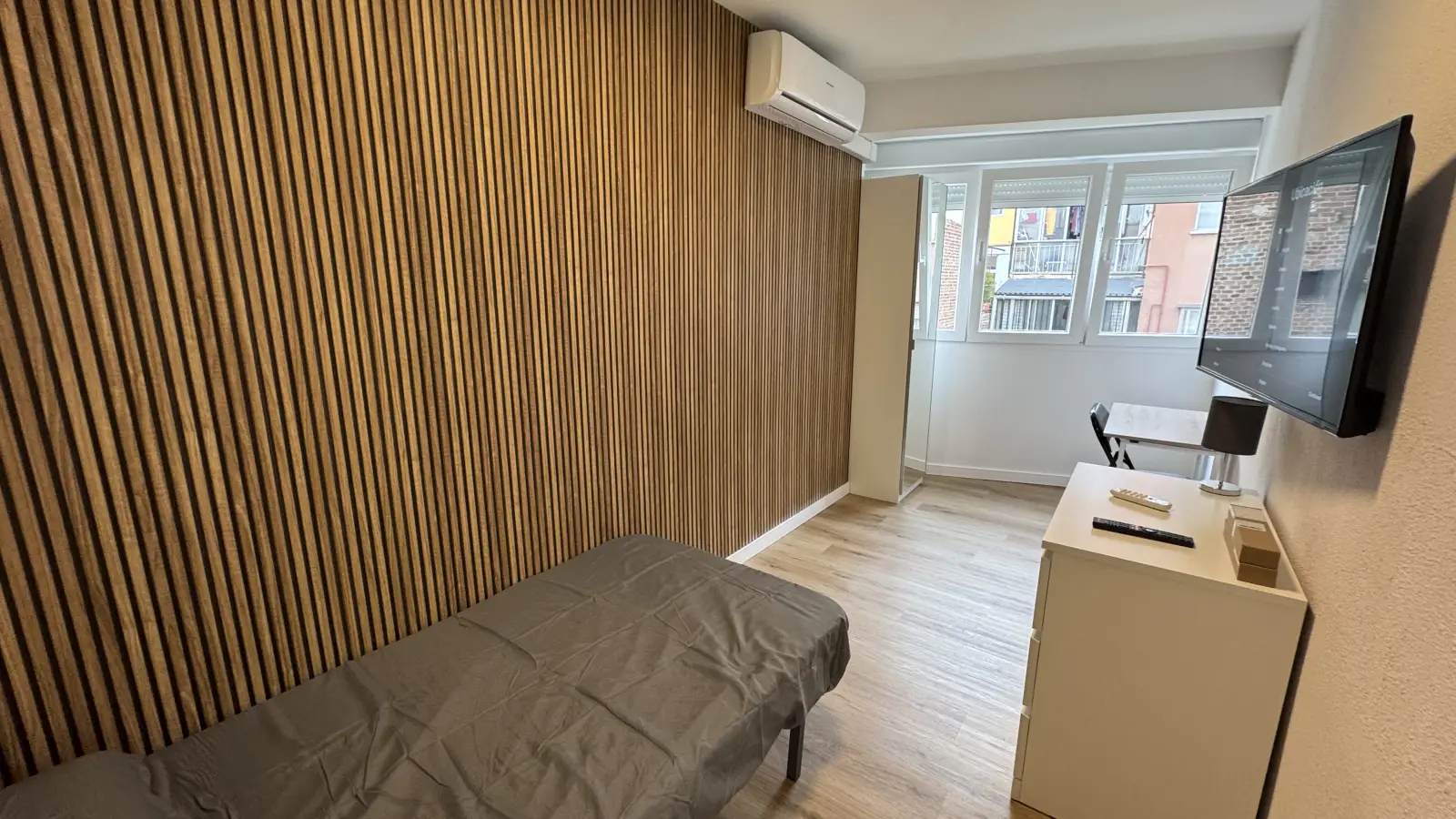 This room is available in a shared 4-bedroom apartment located in Ventas, Madrid. The apartment is fully furnished and includes individual air conditioning units for climate control. The kitchen comes fully equipped with modern appliances, including a dishwasher, oven, and dryer. The bathroom facilities are shared and there is no elevator in the building. Additionally, all necessary utilities are included in the rent, such as water, electricity, gas, and high-speed Wi-Fi. Spotahome has verified this property, ensuring its reliability and quality for your next home.