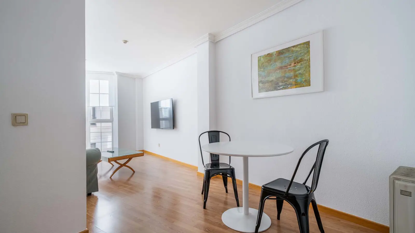 This modern studio for rent in the neighborhood of Guindalera, Madrid, comes fully furnished and is equipped with central air conditioning and a shared washing machine. Additionally, it features a dishwasher and oven, offering comfort and practicality in one package.