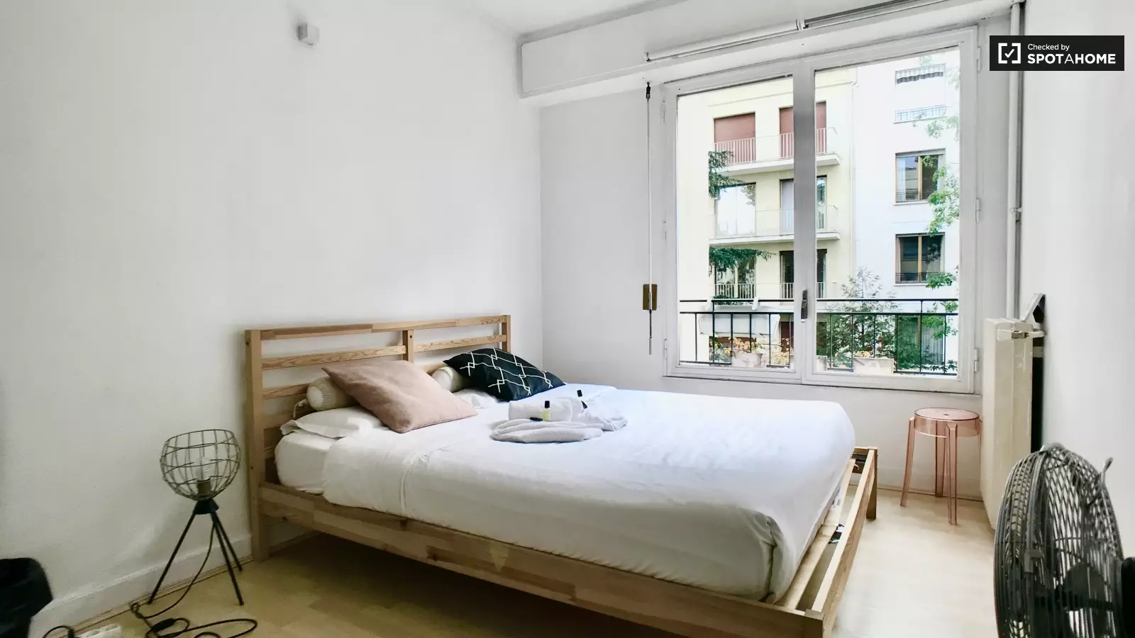 This is a 2nd floor studio apartment on Rue Charles Laffitte in Paris. You have a small kitchenette with ample cupboard space, a double bed, bathroom, and big window.