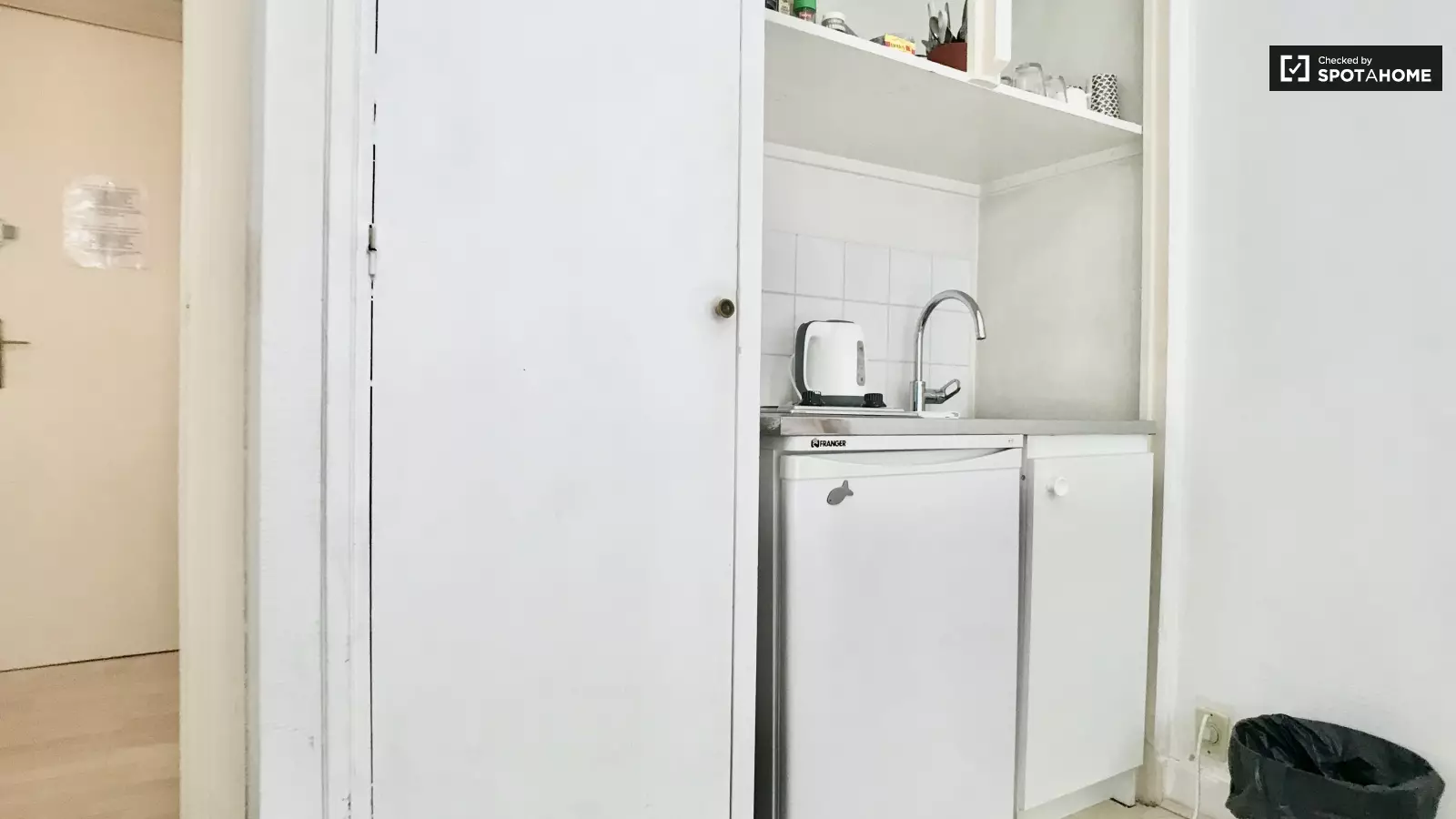You’re in a small studio with high ceilings and lots of sunlight. There’s a little kitchenette with a fridge and hotplate. There’s ample cupboard space to fill with your pots and dishes.