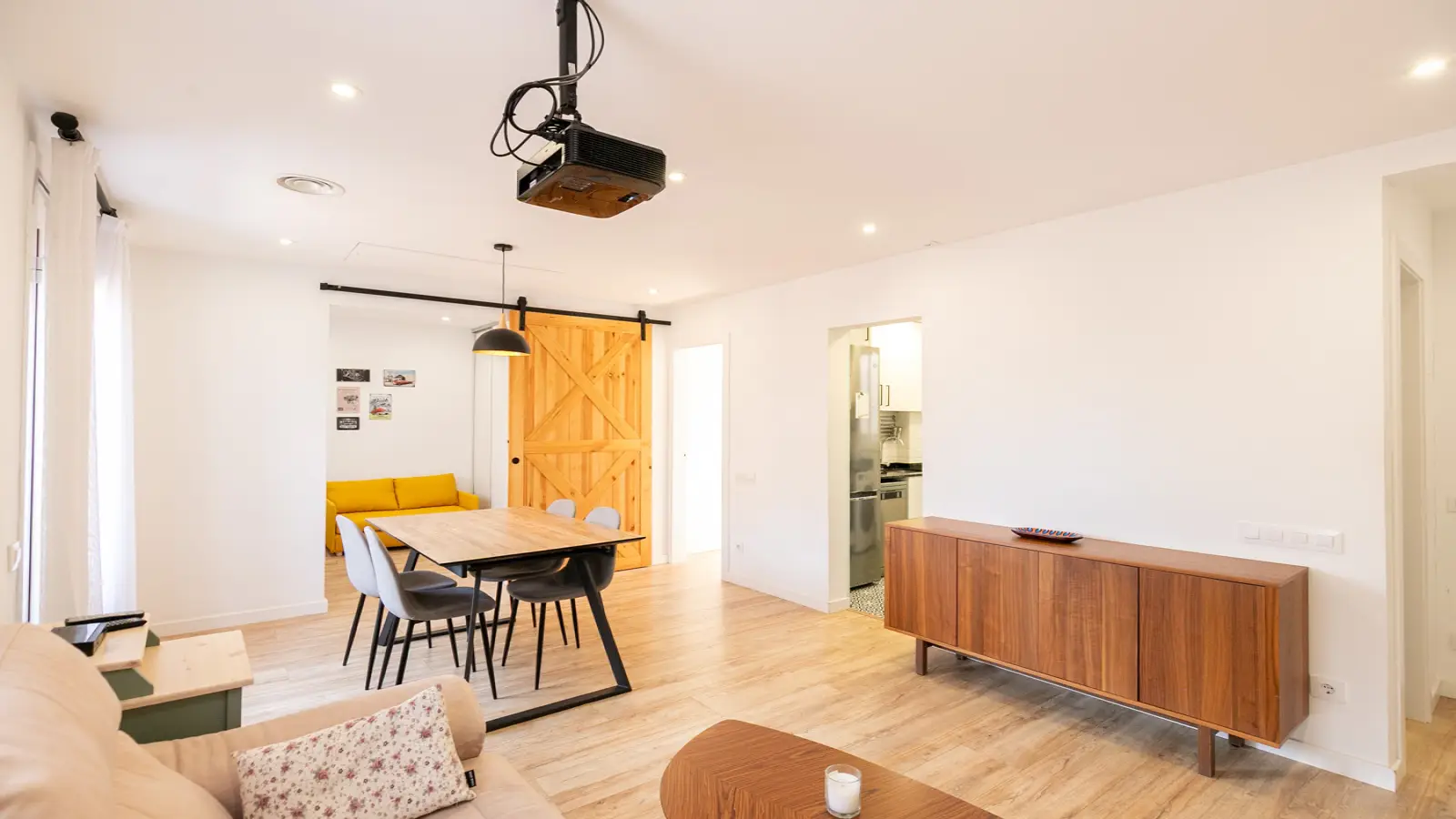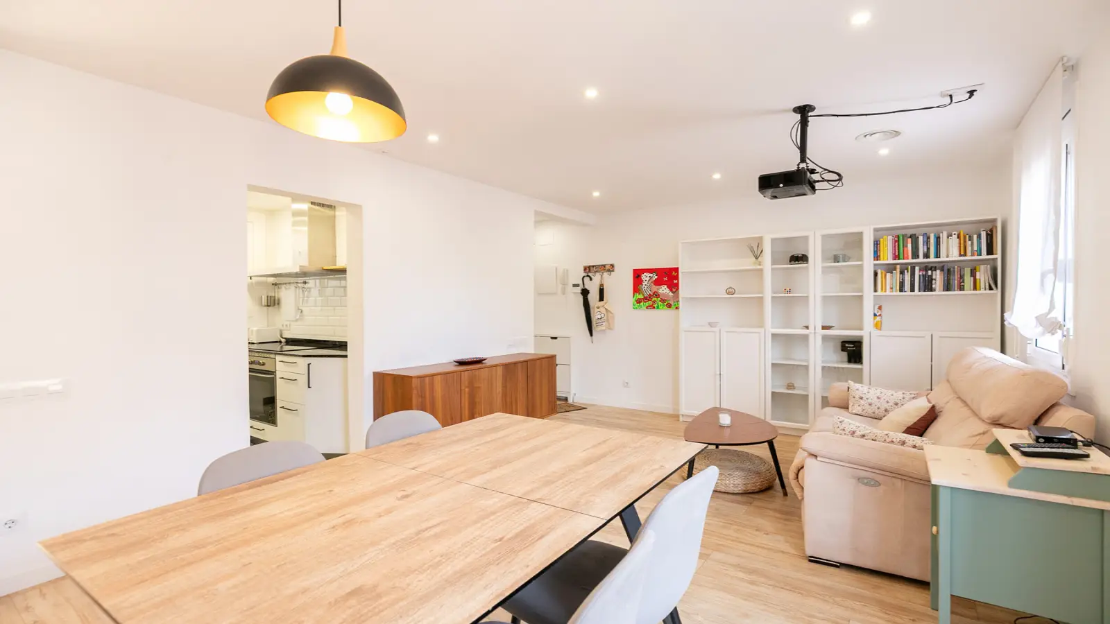 Cet appartement comprend un séjour/salle à manger lumineux avec canapé, projecteur et étagères pratiques de style bibliothèque, ainsi qu'une table à manger pour 4 personnes. De là, vous accédez à un agréable balcon extérieur avec table et chaises, idéal pour savourer un café le matin ou se détendre en plein air avec vue sur la rue.