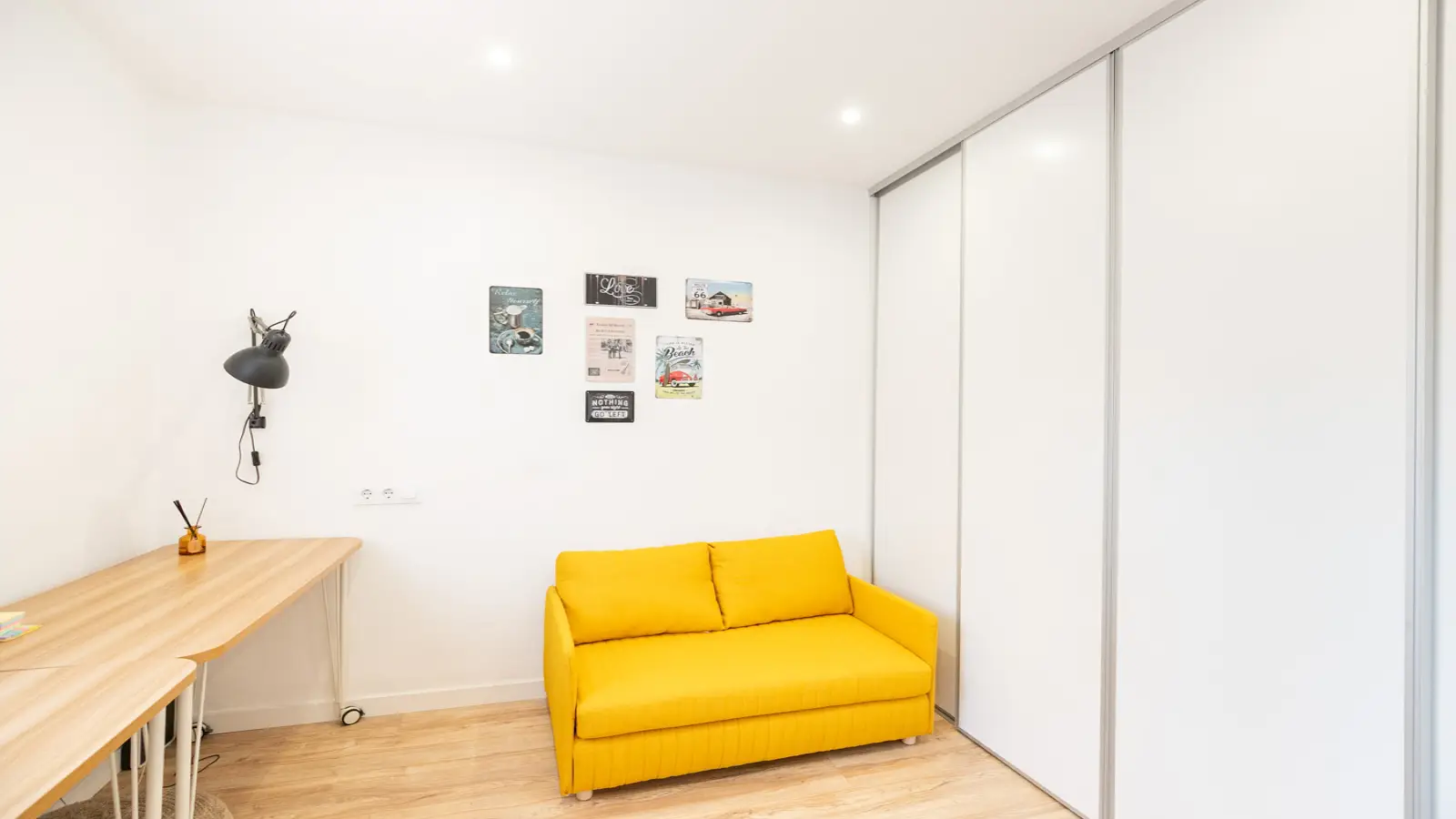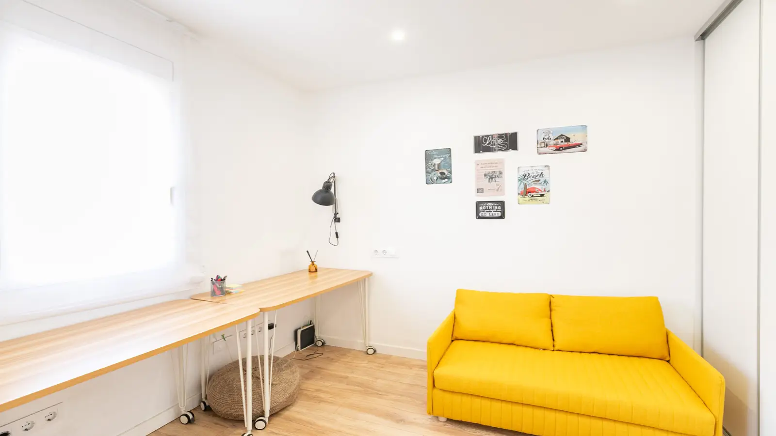 Attenant au séjour se trouve un coin bureau avec placards, table et canapé-lit, parfait comme espace supplémentaire ou pour travailler ou étudier au calme.